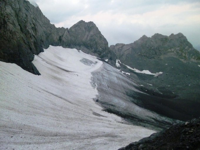 Gletscher: gefroren, unten aper, im oberen Teil (Couloir La Pacheau)dünne Firnauflage, ich war froh um die Steigeisen, Pickel hatten wir nicht dabei.