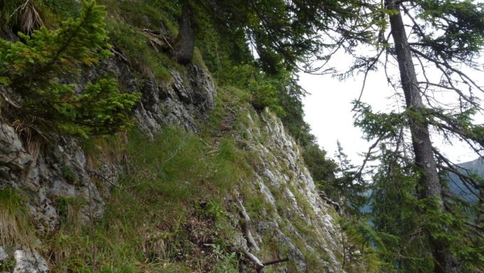 Anhaltend steil auf feuchtem Untergrund ging es dann ins Tal. Die lange Querung südlich unter dem Heuberg ist nochmals sehr herausfordernd. Der Weg ist kaum zu erkennen, steile Rinnen müssen überquert werden und als richtiges Finale kommt der ausgesetzte Abstieg über den Felsriegel hinzu. Der Weiterweg durch den steilen Wald nach Dalaas ist dann nur noch Ausdauersache.