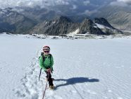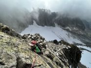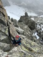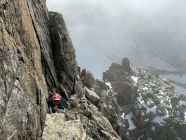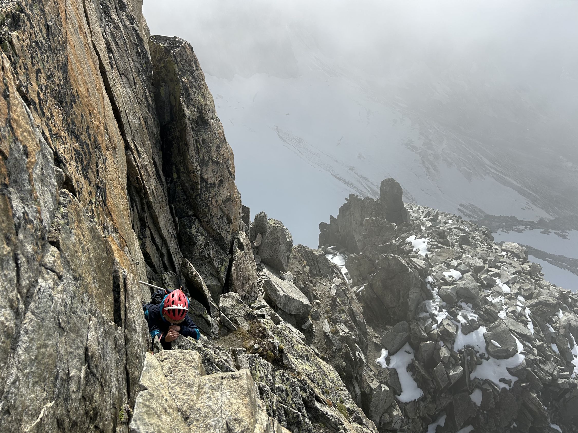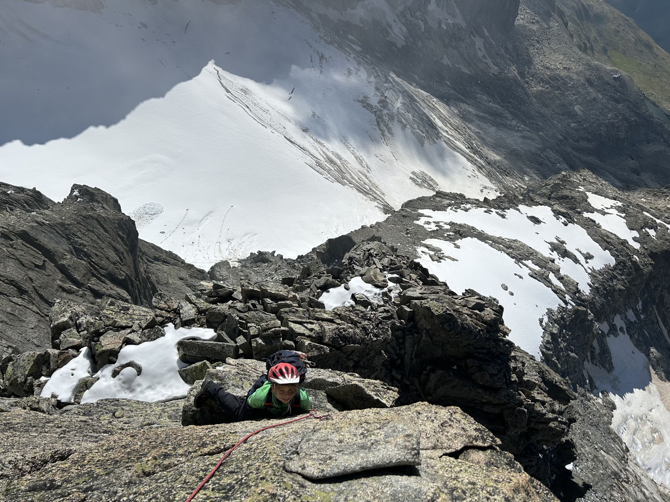 Danach in Blankeis/Firn und leichte Felsplatten hoch bis zum Einstieg des SE-Sporns problemlos. Der Sporn selber ist nur ganz zuunterst etwas brüchig, danach wirklich ausserordentlich schöner Fels, sehr lohnend. Die kurzen Kletterpassagen sind gut abgesichert. Kein nennenswerter Neuschnee mehr in den Felsen.