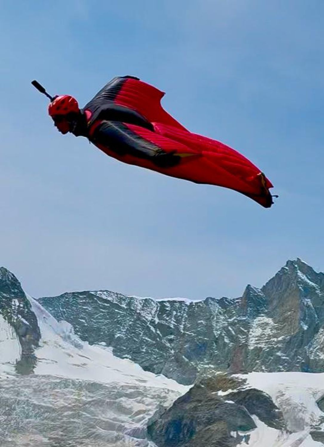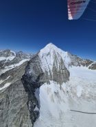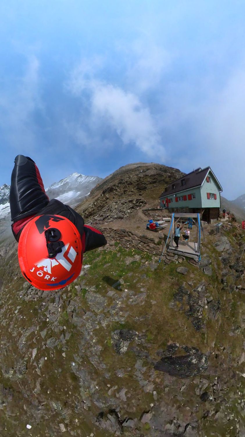 Grosse Aufregung auf der Hüttenterasse: Erstmals sausen zwei Gäste mit Wingsuits und 200 km/h knapp an der Fahne vorbei; Start am Weisshorn beim Ausstieg Schaligrat mit Sprung in die Westwand, Flug um den Schaligrat herum. SIehe Fotos von Walter Stauffacher (Festland) und von der Helmkamera des Hüttengastes Aurelien.