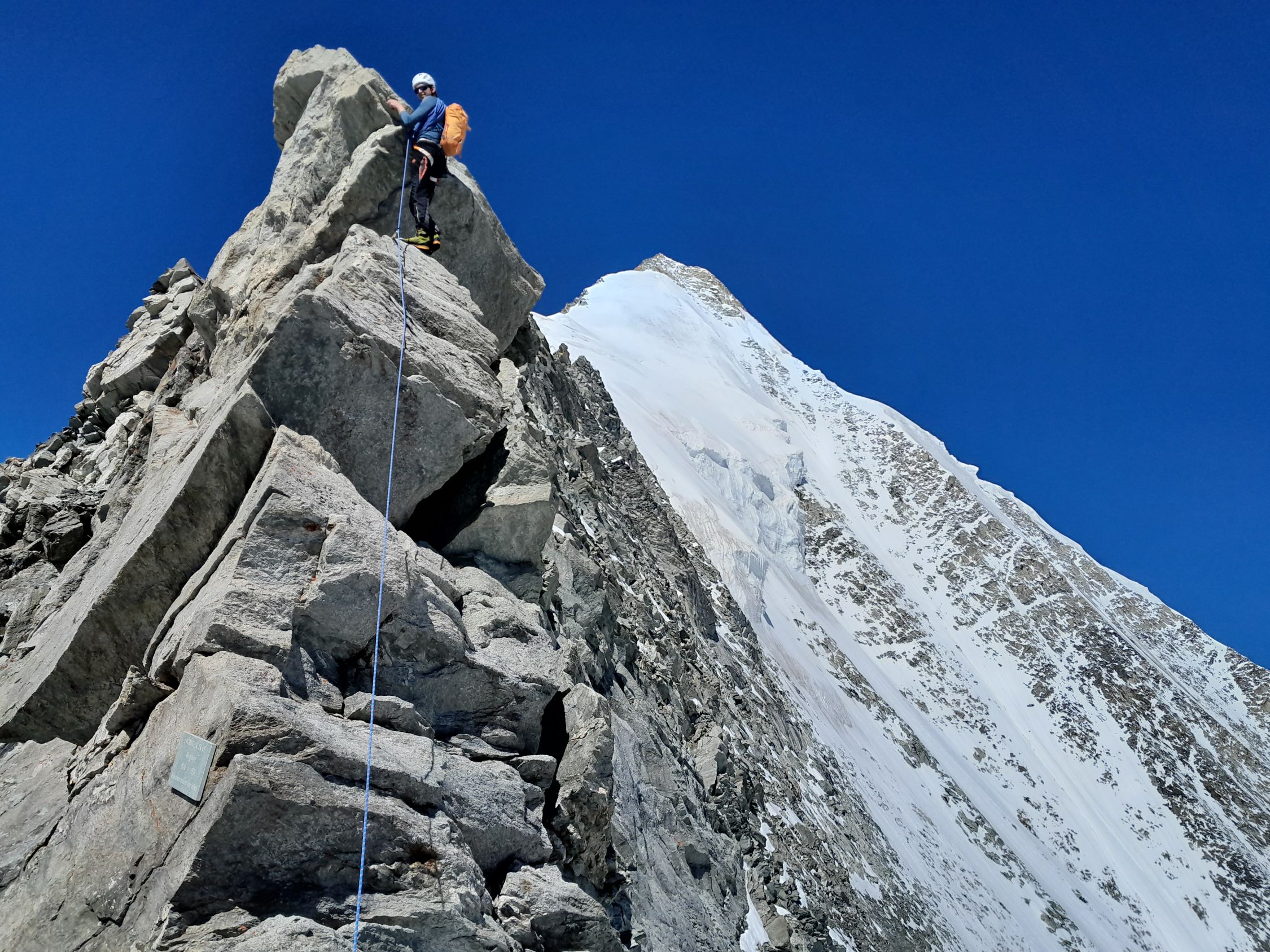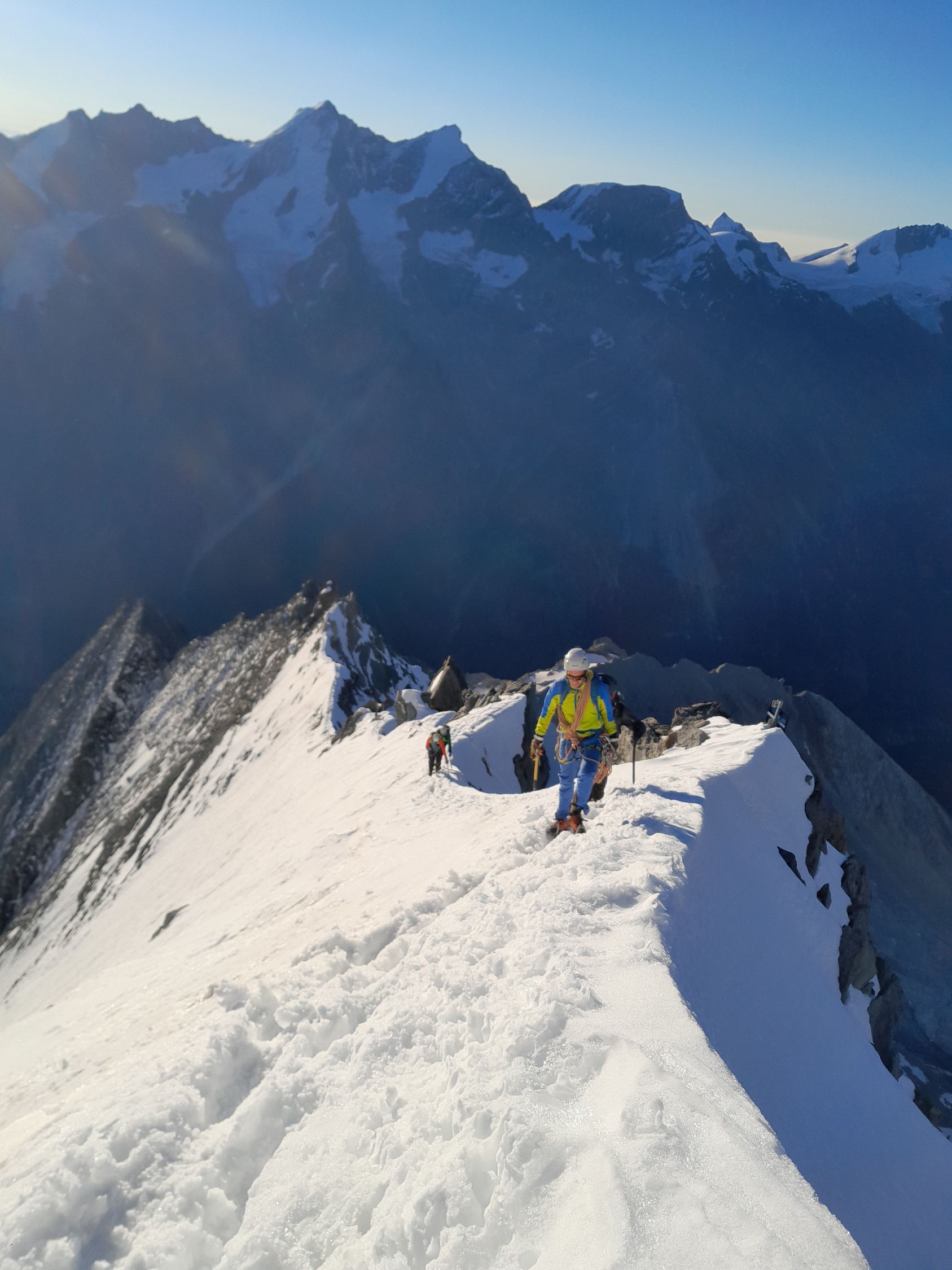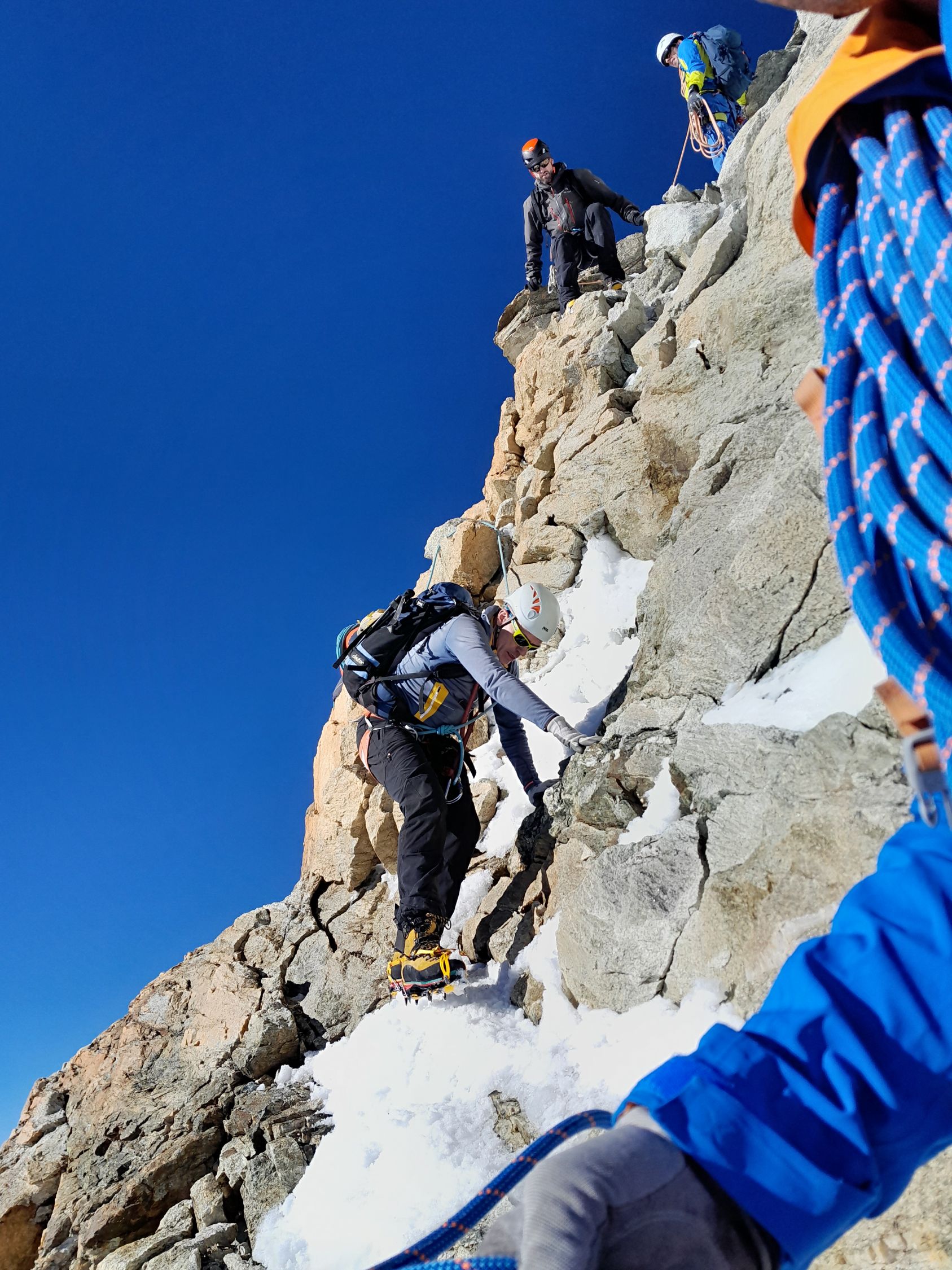 Schaligrat: Noch sehr anspruchsvoll auch heute musste alles mit Steigeisen geklettert werden. Biwak gut ausgerüstet, noch genug Gasvorräte.