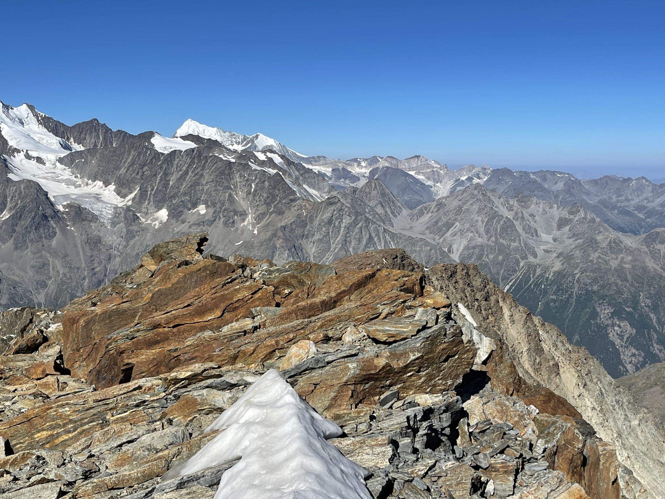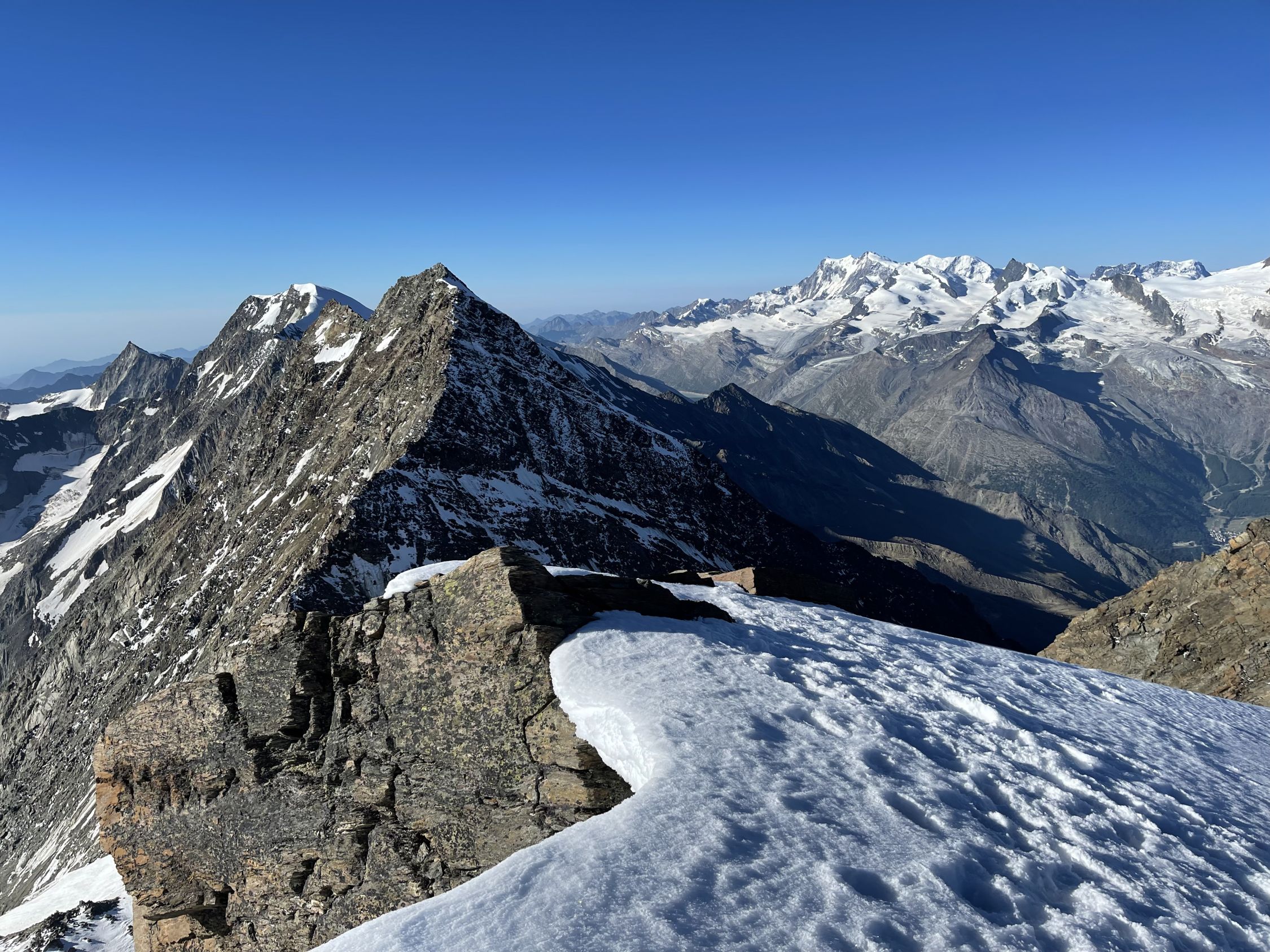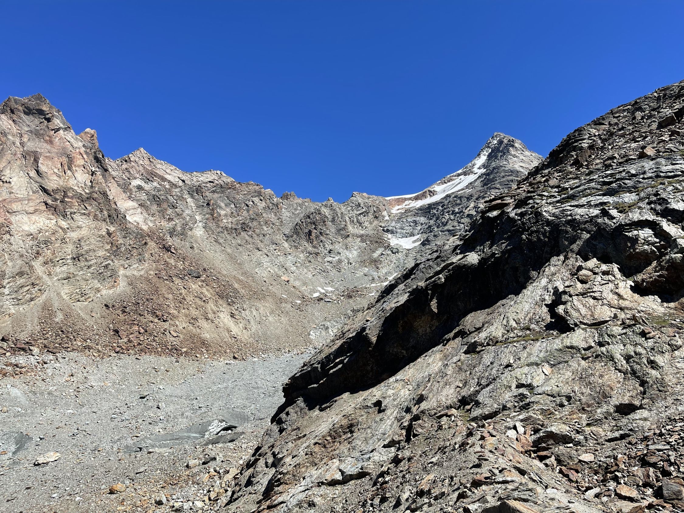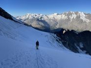 Im Abstieg war der untere Teil nach dem Gletscher wieder sehr unübersichtlich und zeitraubend. Die meisten Seilschaften queren deshalb aufs Lagginhorn