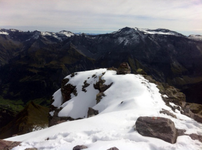 Das Band zu Pkt 2612 ist durchgängig mit Schnee belegt aber problemlos. Der Aussstieg aus dem Kamin (direkte Variante) hat eine Schneezunge die ins Kamin runter reicht, die bald wieder verschwunden sein dürfte und es angenehmer machen wird dort hochzusteigen. Der Abstieg über die Normalvariante ist bis auf den Durchstieg beim Felsband aper. Der Durchstieg beim Felsband nahe Pkt 2515m ist durchgängig mit Schnee belegt.