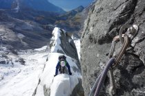 Bis 2700m aper. Oberhalb hat es – insbesondere in Muldenlagen – Schnee. Bis auf den Grat erschwert diese Schneeauflage die Begehung wahrscheinlich nicht. Im Grat selbst wäre es sicher einfacher ohne den Schnee, die eigentlichen Kletterstellen sind jedoch aper und die Bohrhaken sichtbar. Zur Atmosphäre trägt die Schneeauflage sicher einiges bei! Langer Zustieg in der Dunkelheit. Es ist bis zum Gletscher nicht ganz einfach die optimale Route zu erwischen. Ich habe den Routenbeschrieb angepasst und mit einem Foto ergänzt, ich hoffe es hilft.