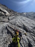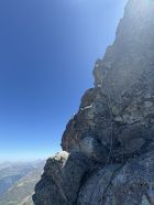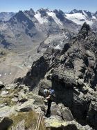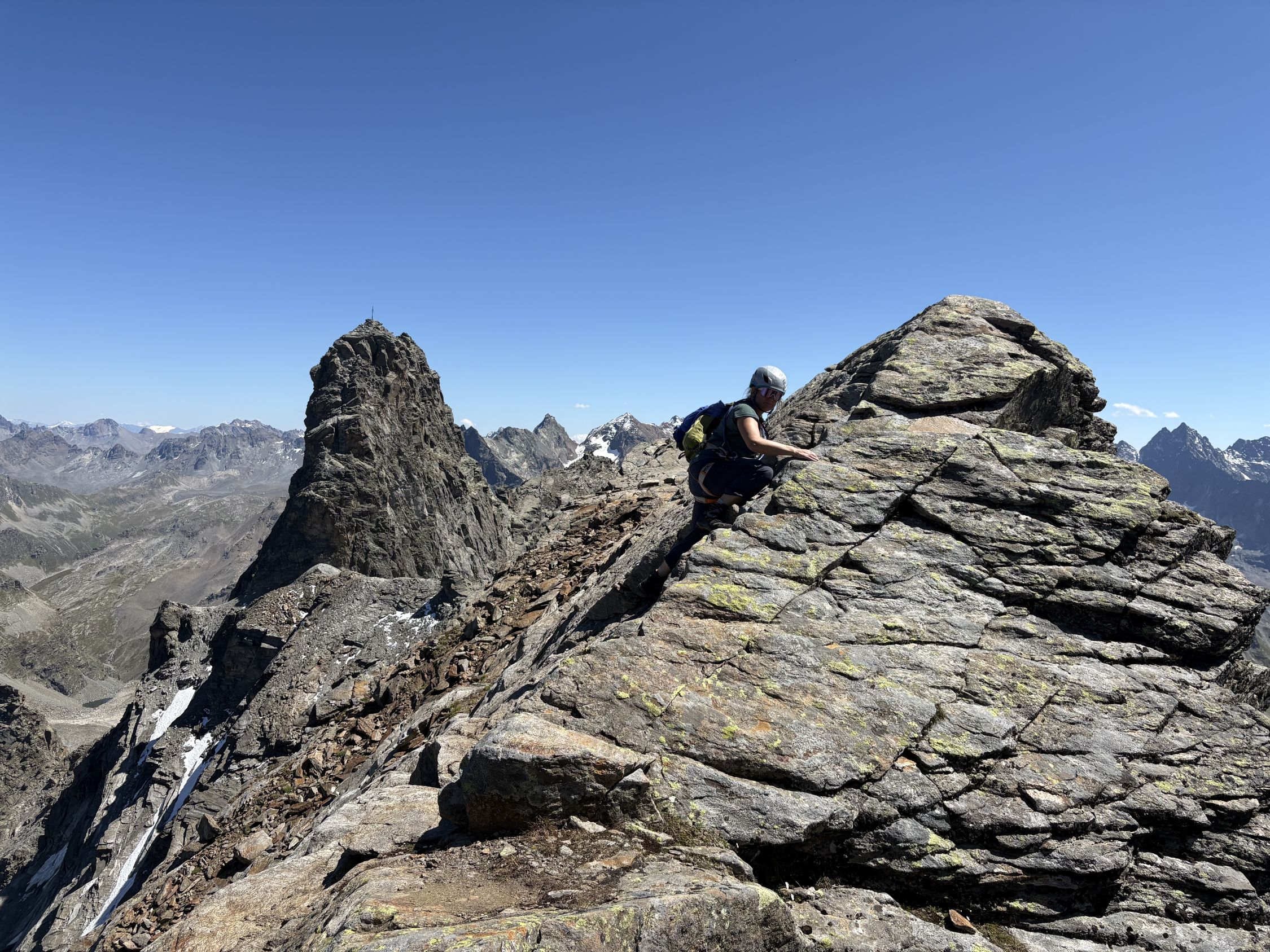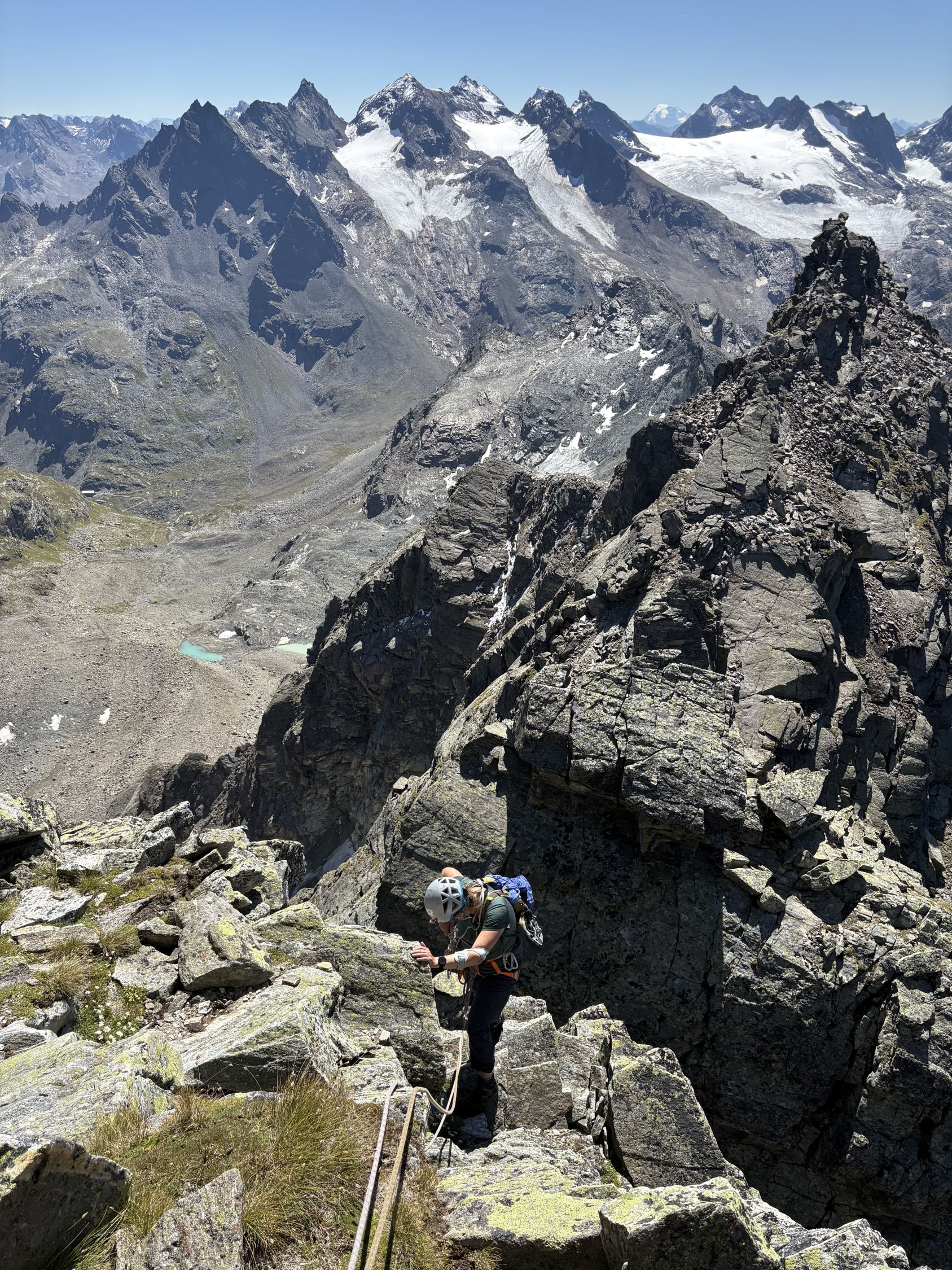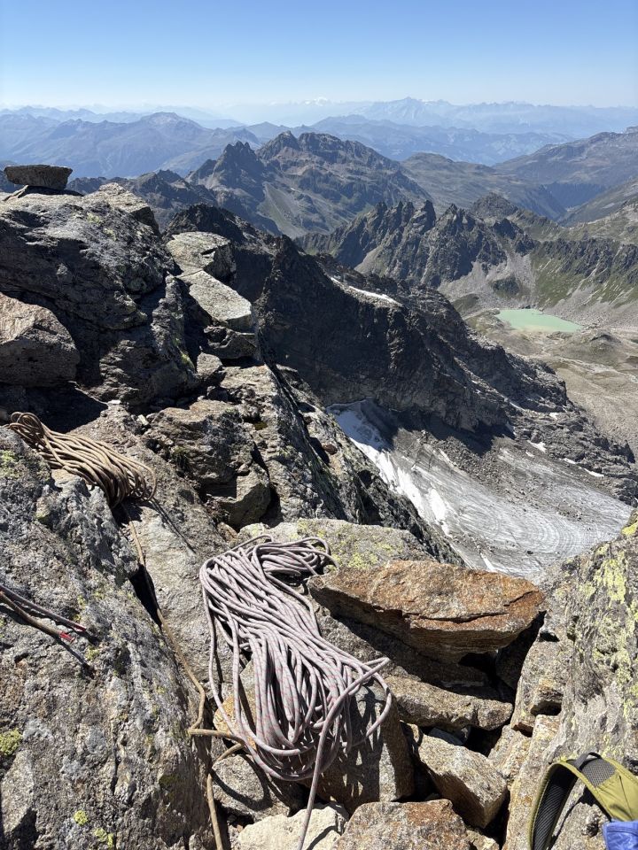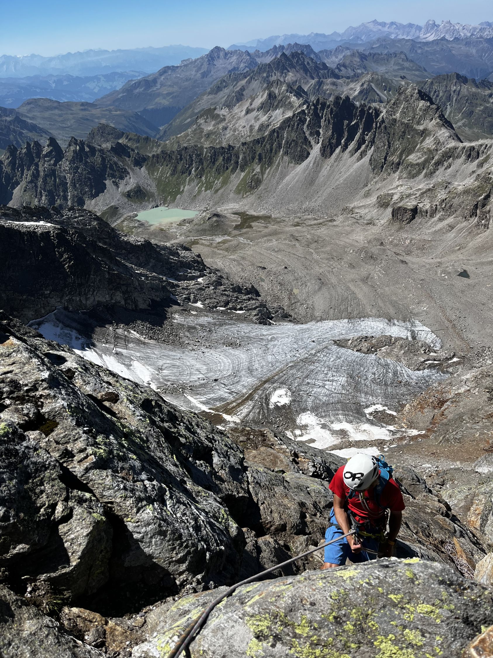 Alles trocken und kein Schnee. Gletscher blank und schon sehr zurückgegangen. Routenfindung, abseilen und die Länge der Tour sehe ich als Schlüsselstelle. Die Kletterstellen nie schwieriger als 4a. So gut wie immer selber abzusichern. 4 Exen und 4 Friends mit Schlingen sinnvoll. Wir hatte 2x 60m Halbseile dabei. Zur das Abseilen am Seehorn direkt vom Gipfel ging das mehr oder weniger gut. Seil Hänger inklusive. 60m Einzel wäre auch passend. Es hat neue Abseilstände beim Gross Seehorn bis ganz zum Gletscher. Diese sind eher links vom Gipfel zu finden.