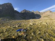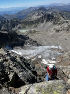 Wir benötigten 12h mit gemütlich und langen Pausen. Abstieg via Seehornscharte in 1h die sehr viel Schotter hat zum Biwakplatz.