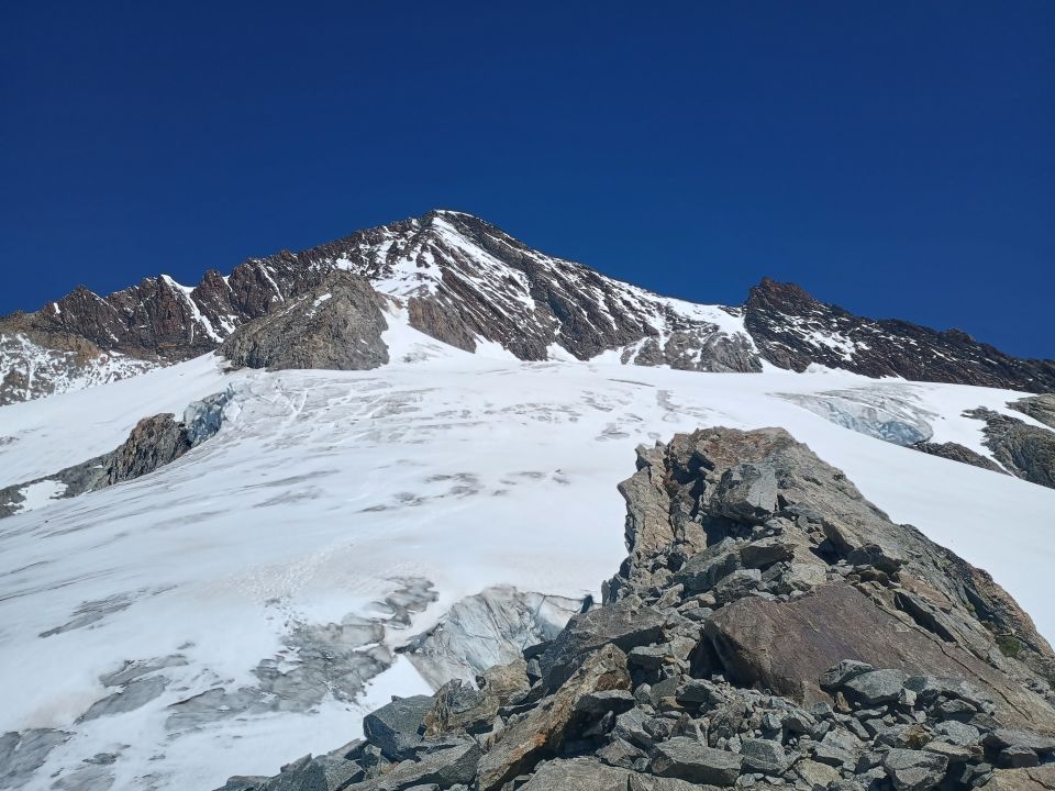 Bis zum Gletscher trocken und schneefrei. Gletscher nur noch dünn eingeschneit, einige Spalten - Vorsicht ist geboten. Im oberen Teil noch gut schneebedeckt, Aufstieg dadurch allenfalls angenehmer als sonst (schuttig?...).