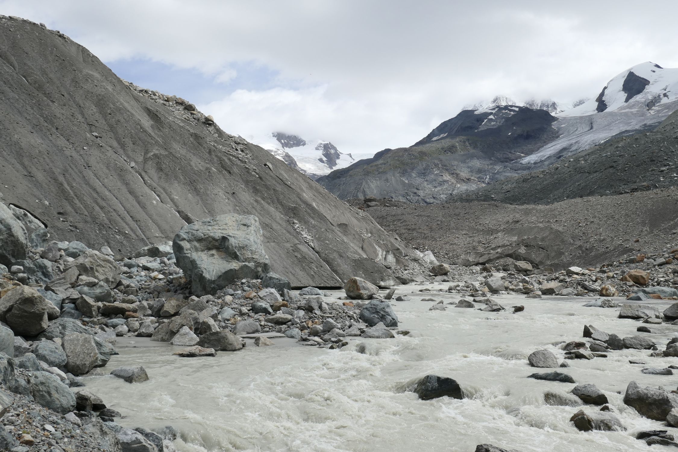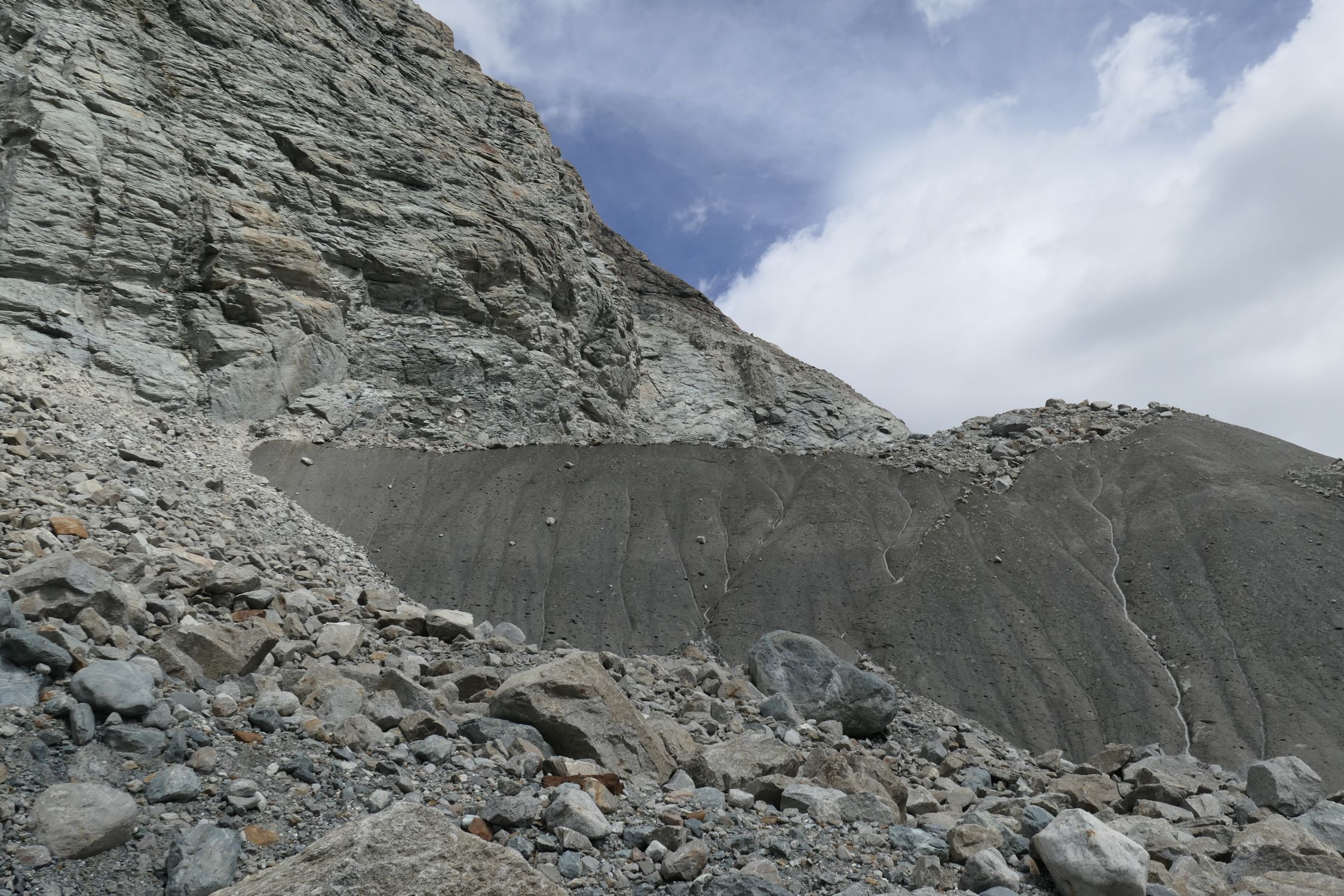 Ich bin nicht gut im Schätzen von Höhen, aber eine ca. 20 m hohe Eiswand, die nach unten direkt in den Gletscherbach führt und von oben durch Steine und Felsblöcke bedroht ist, die jederzeit runterstürzen können, verhindert es, den Gletscher auf der "richtigen" Seite der Gornera zu verlassen.