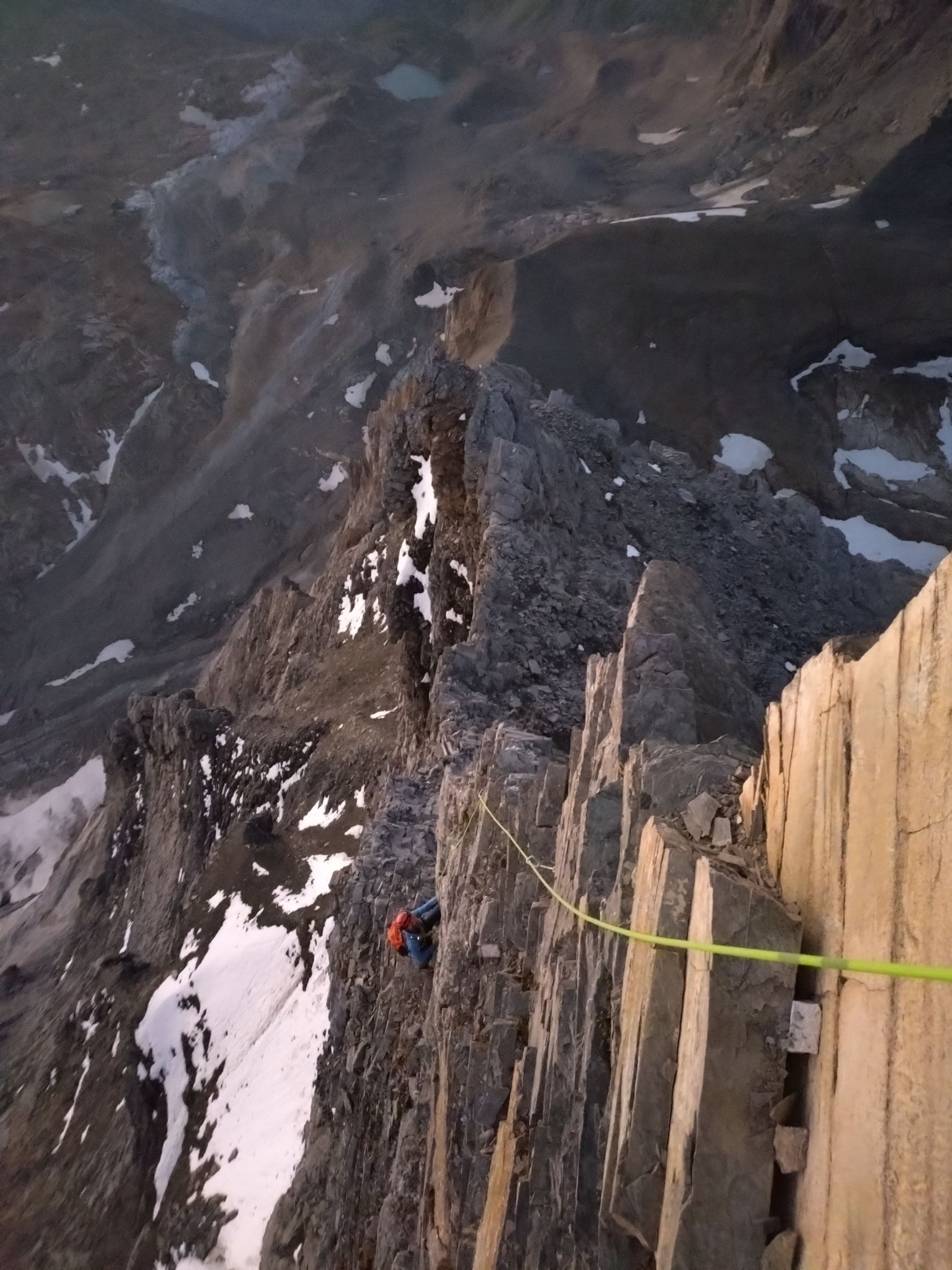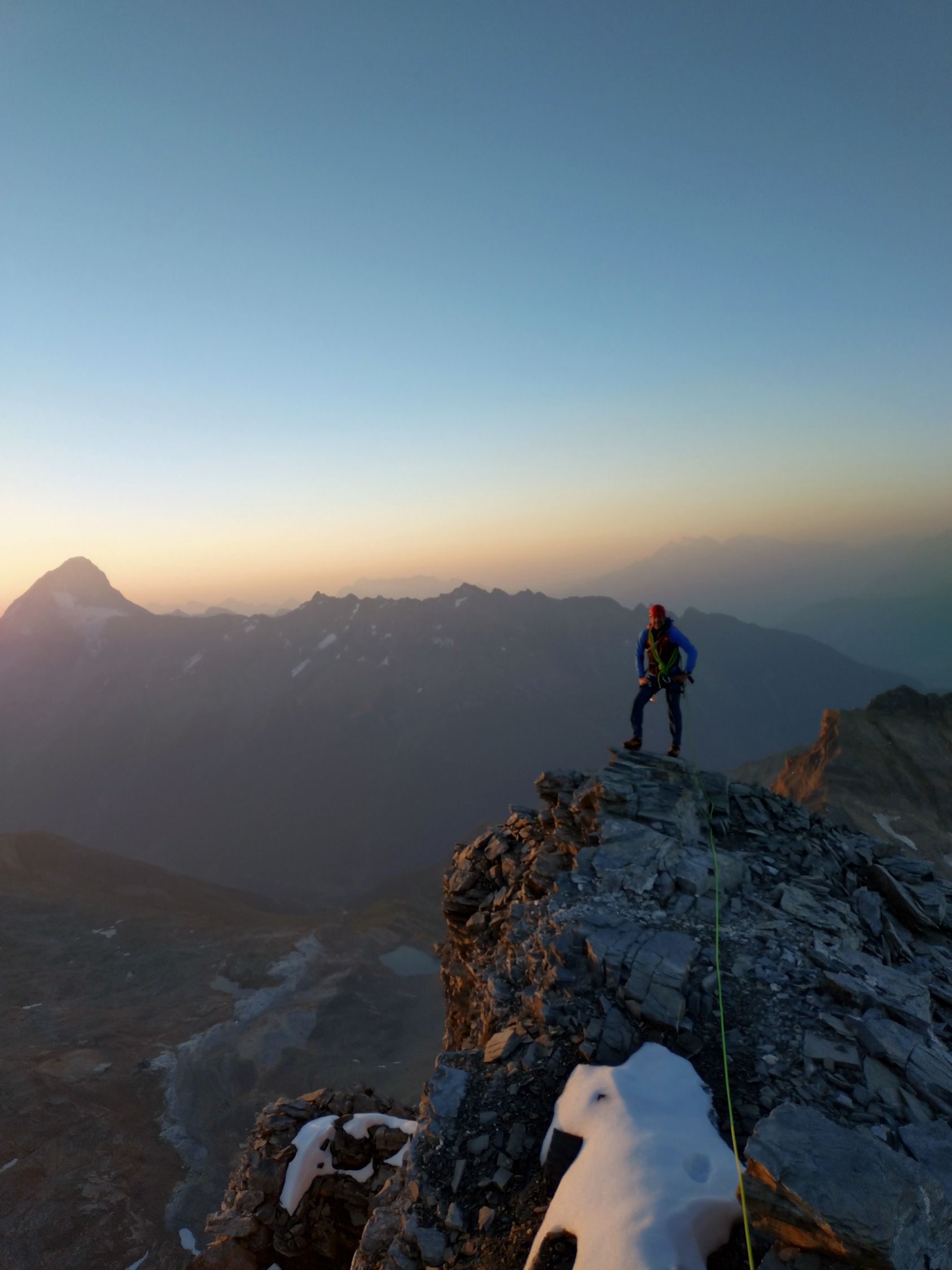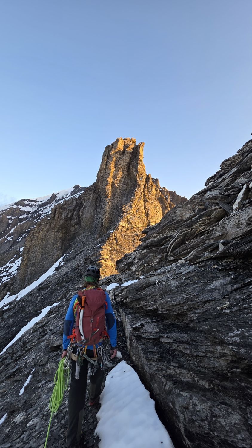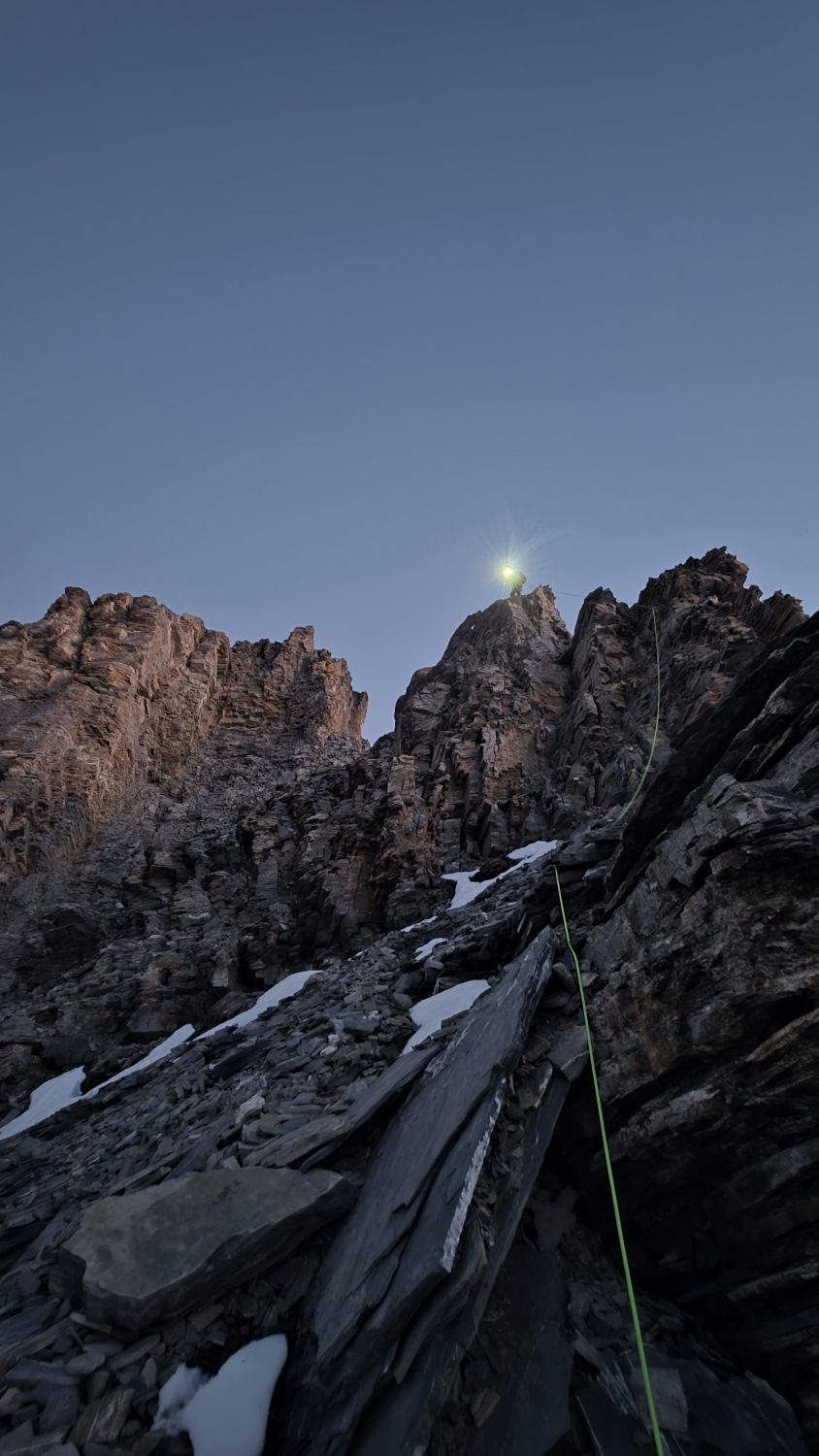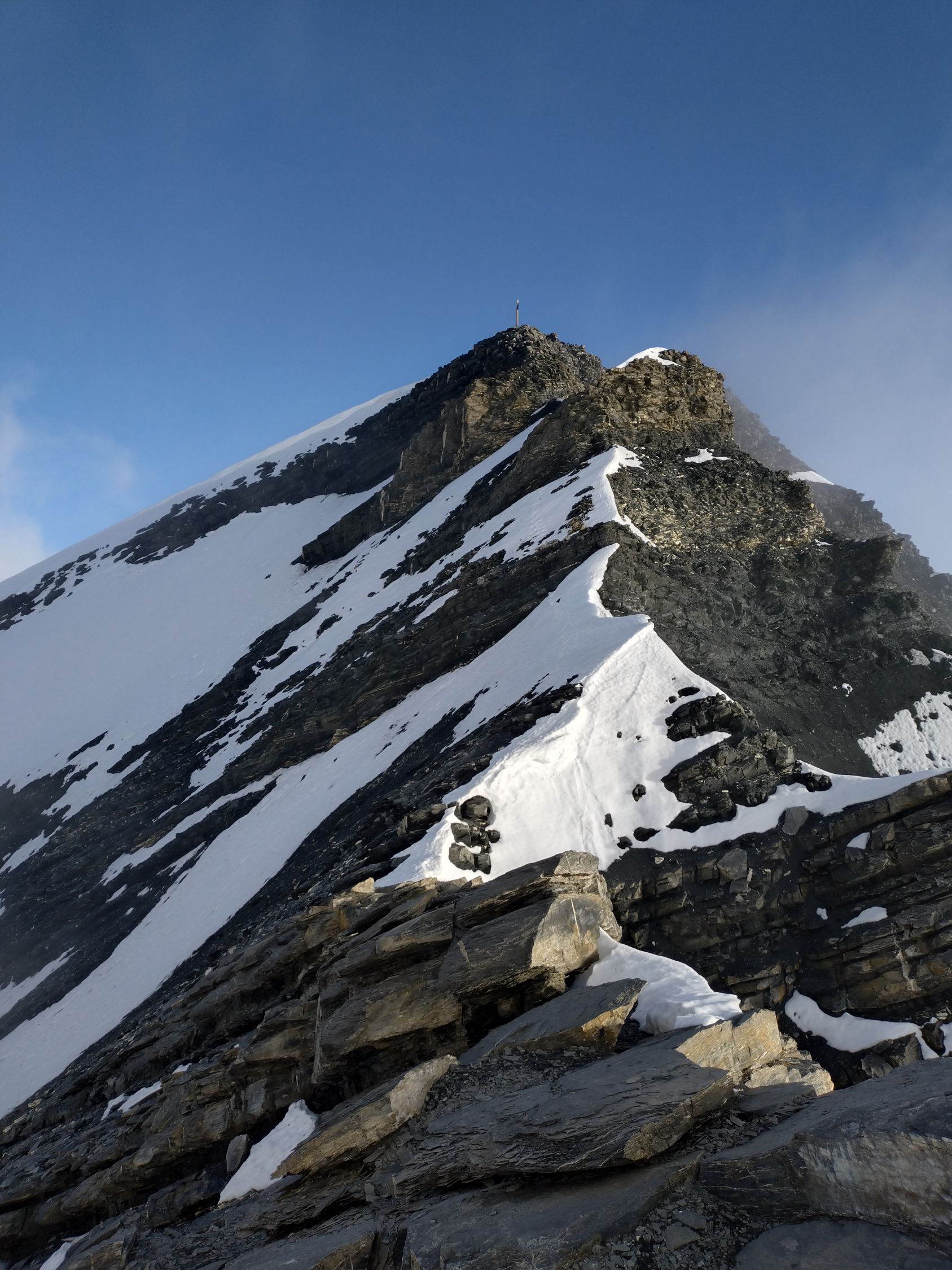 Grat trocken und ideale Verhältnisse, nur auf den obersten paar Metern noch wenige Schneereste, welche sich aber ohne Steigeisen begehen lassen. Wie oft geschrieben wird der Grat nach oben zunehmend brüchiger, lässt sich aber mit der nötigen Vorsicht gut klettern. Schnee bis zum Gipfel nicht gefroren und feucht.