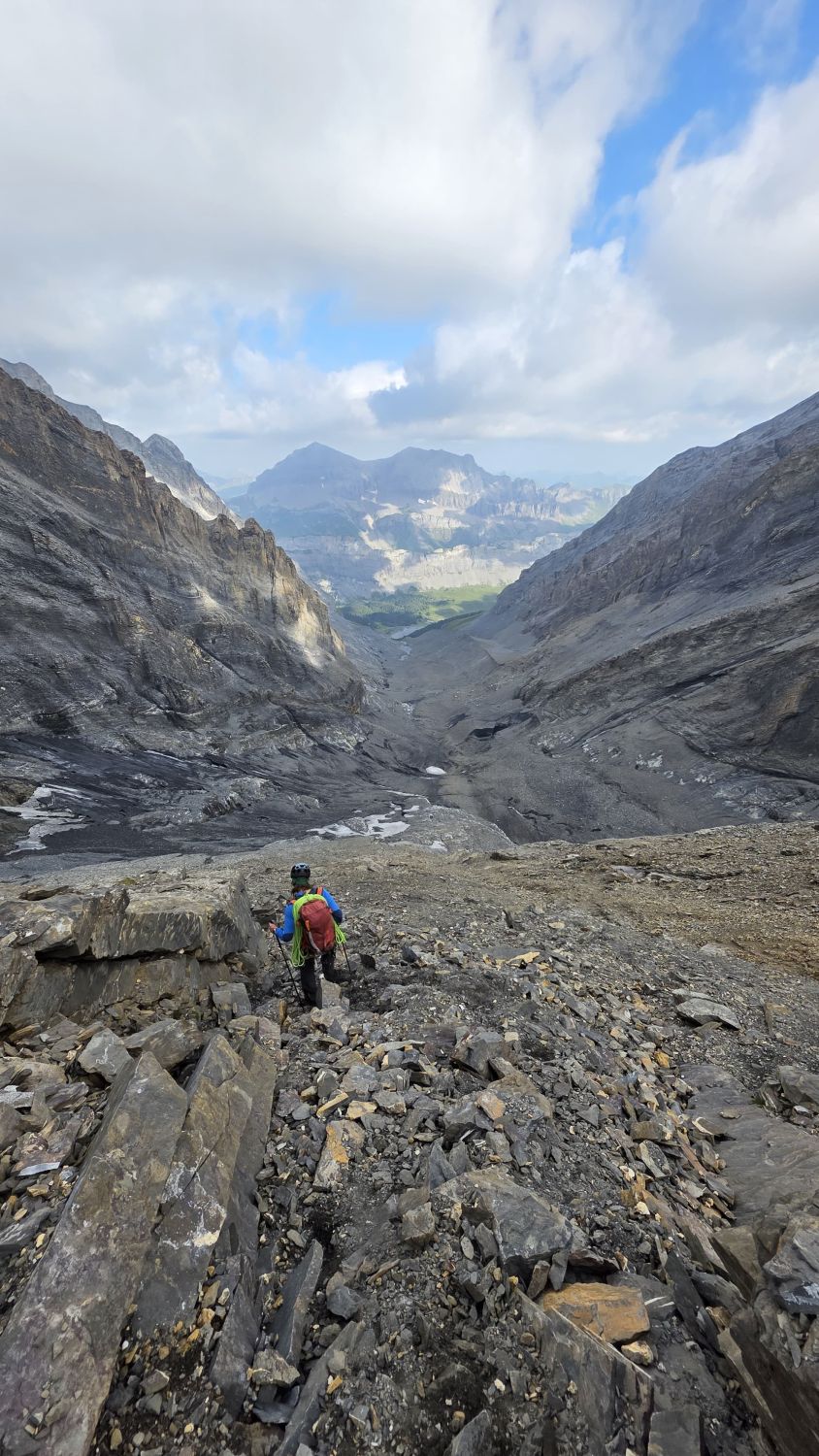 Auf dem Gipfel leider dichter Nebel und starker Wind, weshalb wir auf die geplante Überschreitung zum Altels verzichtet haben. Abstieg dann über den Zackengrat. Dies ging viel besser als wir es aufgrund der hier vorhandenen Verhältniseinträgen erwartet hätten. Wichtig ist einfach, dass man dort wo man den Grat verlässt bis auf rund 2900 m in der Falllinie nach unten absteigt (schwache Wegspuren und Steinmänner) und erst dort nach Westen auf den schuttbedeckten Gletscher quert. Diese Variante verläuft östlich von der Normalroute. So ist man vor Steinschlag relativ lange geschützt (heute zwischen 9 und 10 Uhr wars ruhig) und kann zudem den gesamten Abstieg ohne Steigeisen und Pickel machen (wenn man sich in diesem Gelände gewohnt ist). Das sonst beschriebene, mühsame Blankeis mit Schuttauflage kann so umgangen werden. Vergleiche dazu auch den angefügten GPS-Track.