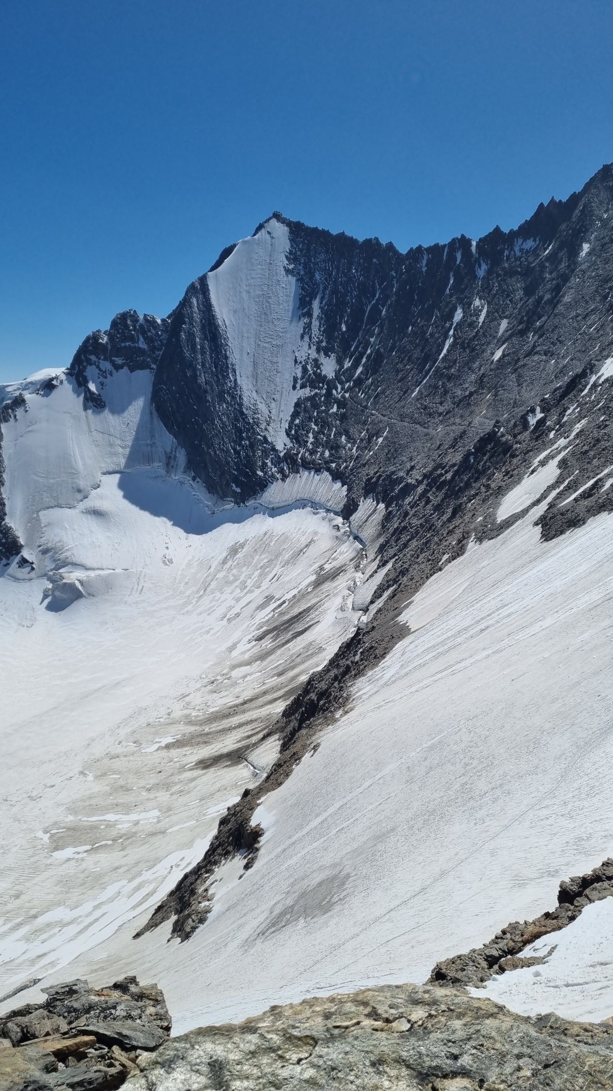 Kaiserwetter, gute Fernsicht, warm, oben tw. leichter Wind. Alles trocken ab Bordierhütte bis Riedpass. Einzig beim Vorgipfel des Balfrins muss man kurz über Schnee- bzw. Firn, wenn man das nicht mühsam rechts in den Felsen umgehen will. Ab Riedpass ist der Schnee weich, so dass man immer wieder einbricht, was die Sache anstrengend macht. Gegen das Ulrichshorn wird die Schneequalität besser. Abstieg bis unterhalb Schwarzberg gut auf dem schneebedeckten Gletscher, Windjoch bestens eingeschneit. Weg ab Schwarzberg wieder aper und trocken. Ausweichen auf den Gletscher macht ab da keinen Sinn.