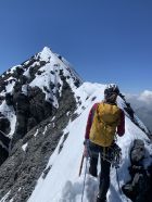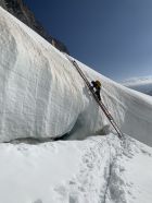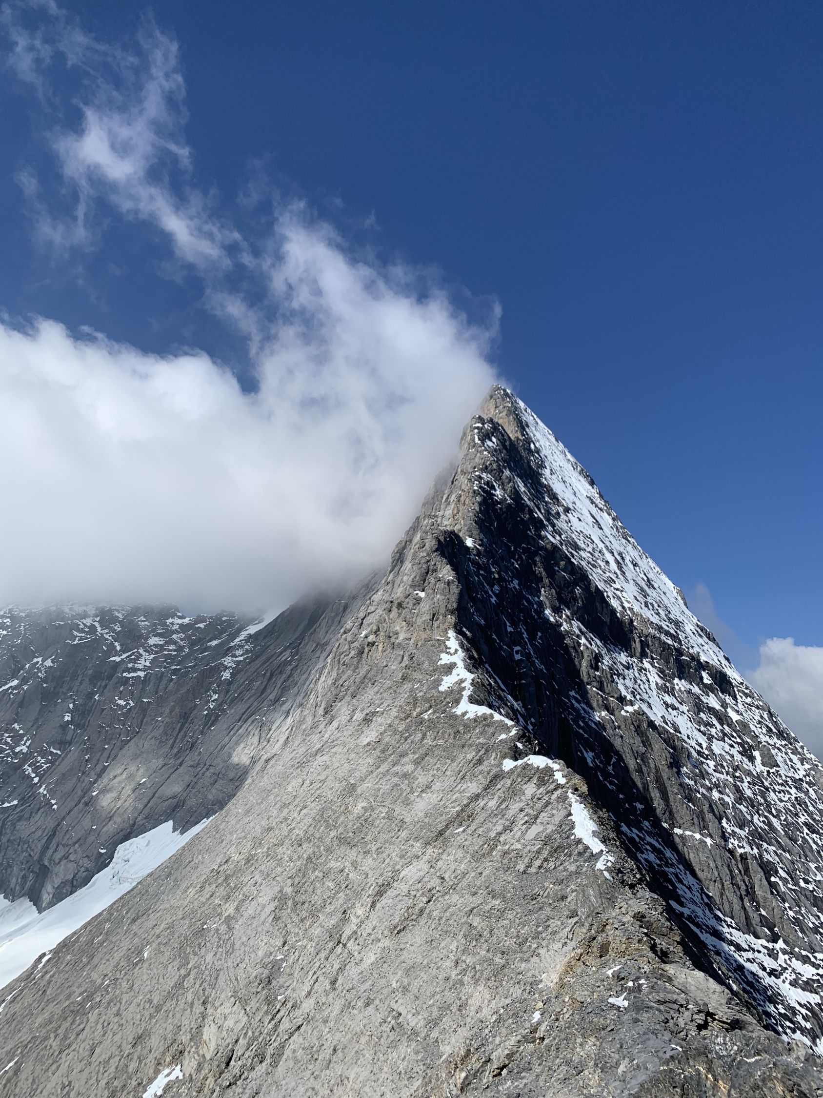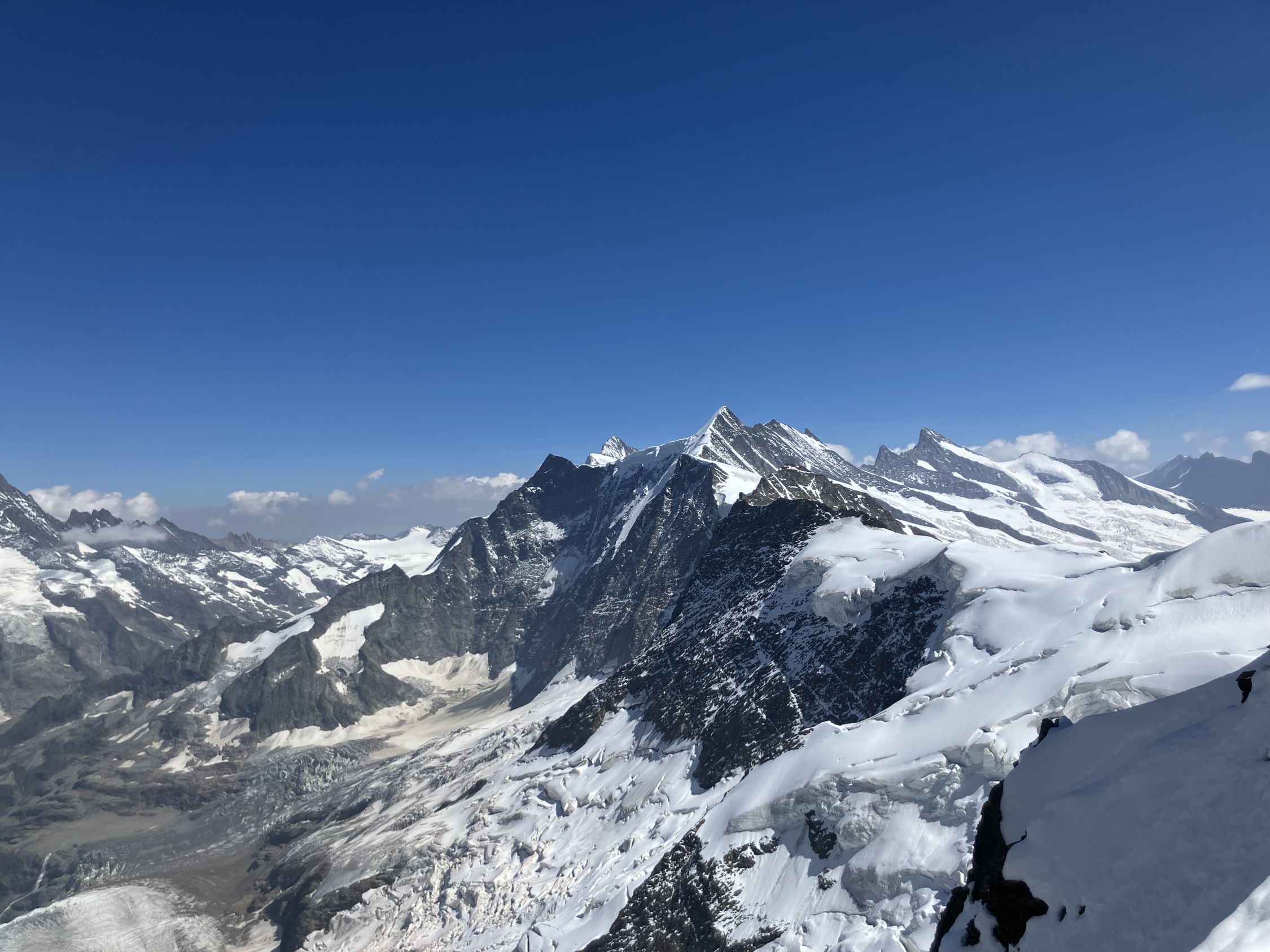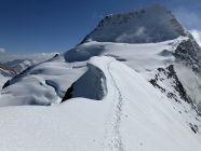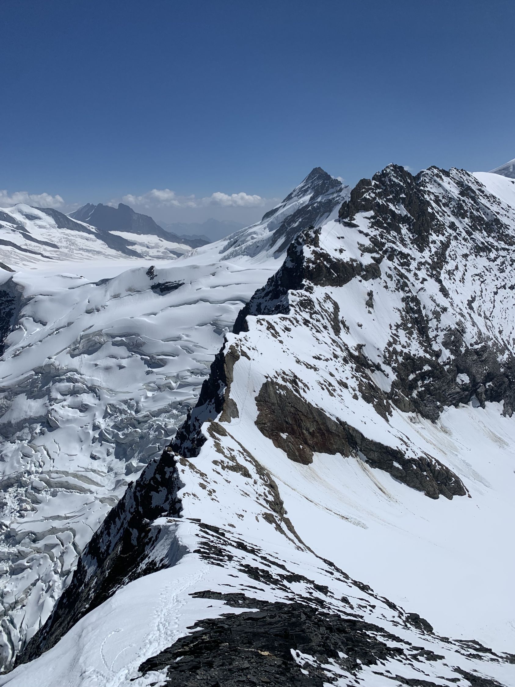 Erste Bahn 7:45, Start Eismeer 8:10 Uhr, retour Jungfraujoch 17:40 Uhr. Bereits am Morgen sehr warm. Gute Spur über den Gletscher, Leute waren mit und ohne Steigeisen unterwegs. Eine grosse Spalte wird mittels Leiter überwunden. Bänder zur Mittellegihütte trocken. Grat bis auf wenige Stellen aper, der wenige Restschnee störte nicht. Dank des späten Starts kaum Betrieb, nur drei weitere Seilschaften in der Route. Firngrat mit guter Spur. Abstieg Eigerjöcher super. Gletschertraverse zum Mönchsjoch weich, aber gut gehbar. Keine offenen Spalten.