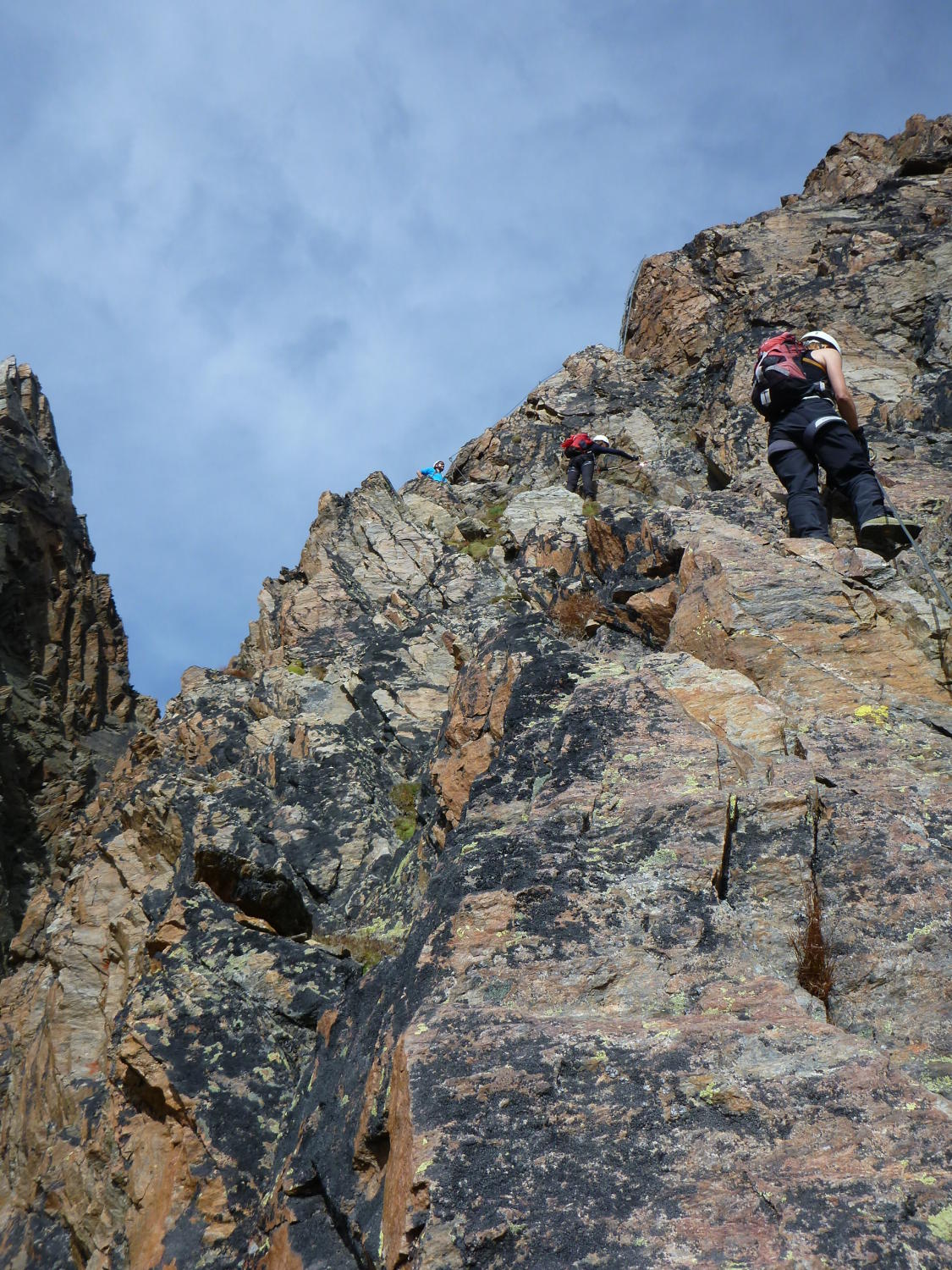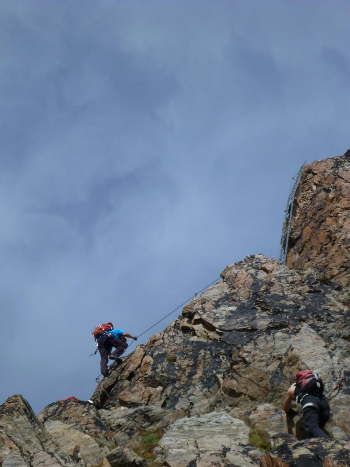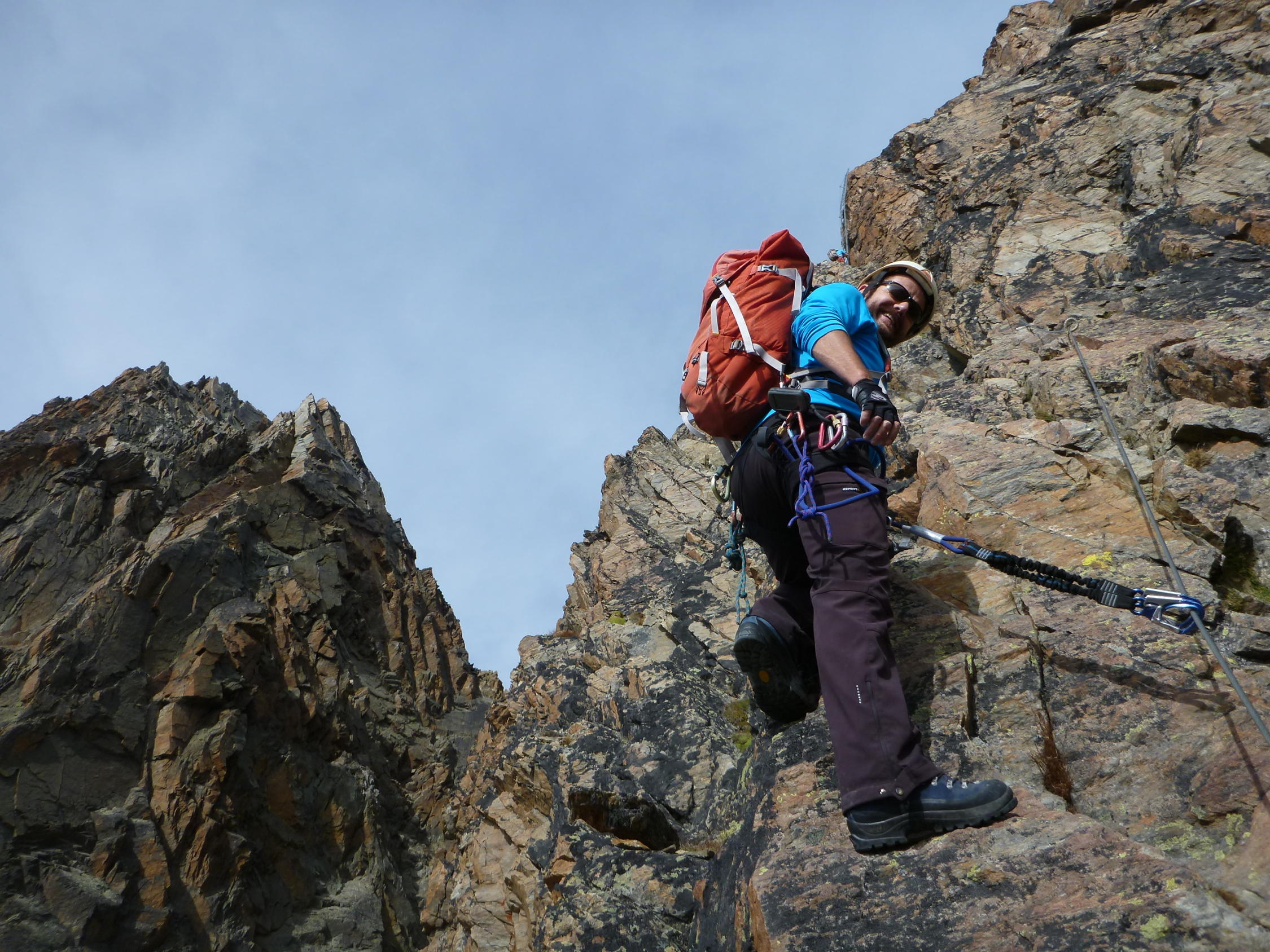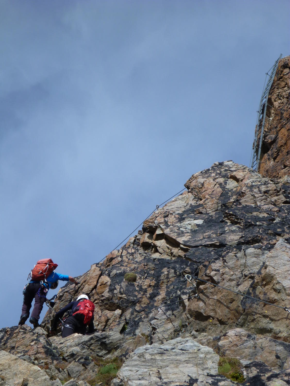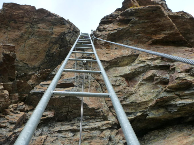 Einfache Kletterei in alpiner Umgebung, umringt von den 4Tausendern, an einem Stahlseil, um das man sich nicht weiter zu kümmern braucht, nach oben, das bietet der Klettersteig Jegihorn.