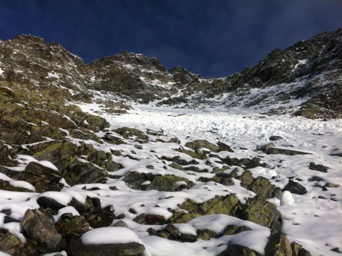 Ab Schneefeld zwischen 1. und 2. Rinne Schneedecke auf der Route. Durchschnittlich 20 cm Schnee auf Altschnee. Neuschnee leicht gesetzt, mit Altschnee verbunden, recht weich. Spurarbeit ab Schneefeld, in den steilsten eingewehten Bereichen bis Knie. Fels an der kleinen "Schlüsselstelle" nach Ausstieg erste Rinne morgens nass. Wegen Verhältnissen nur mässige Abrutschgefahr in der oberen Rinne.