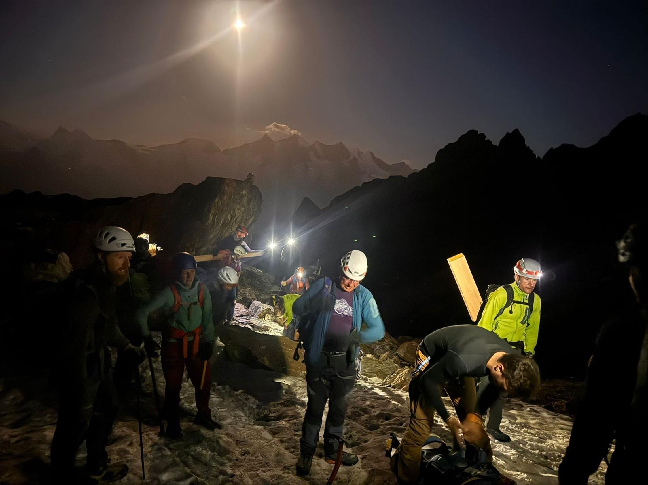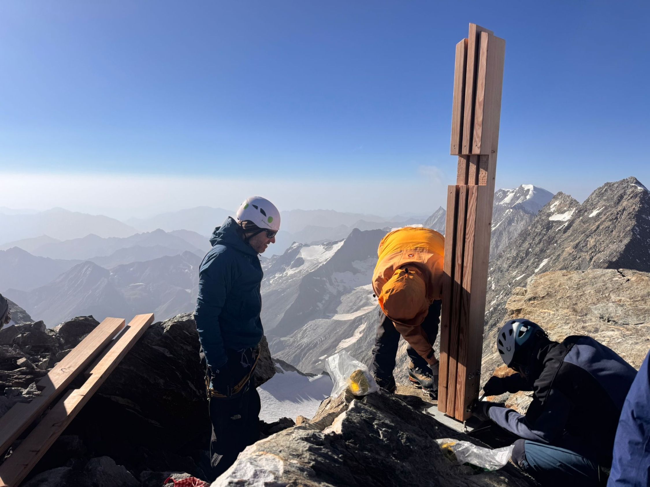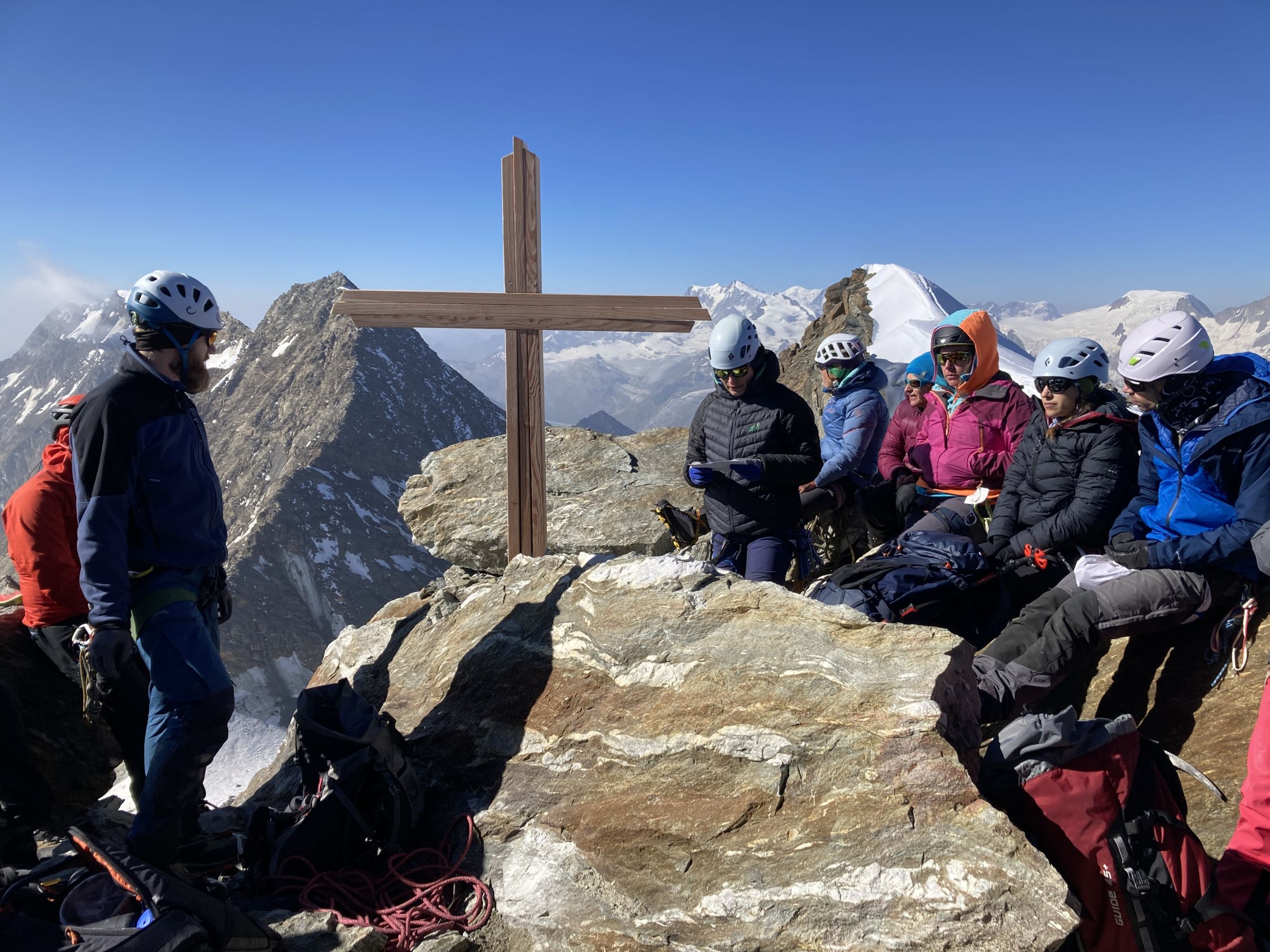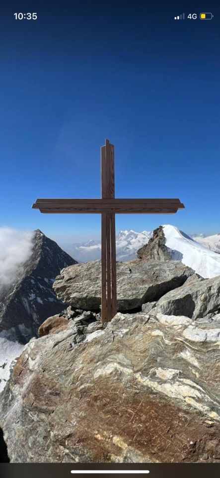 Gut 40 Personen sind heute Sonntag von den Weissmieshütten mit sämtlichem Material aufgestiegen um das neue Gipfelkreuz aufzurichten. Ein gelungener und emotionaler Anlass. Nun hat das Fletschhorn wieder ein Gipfelkreuz. Soli Deo Gloria.