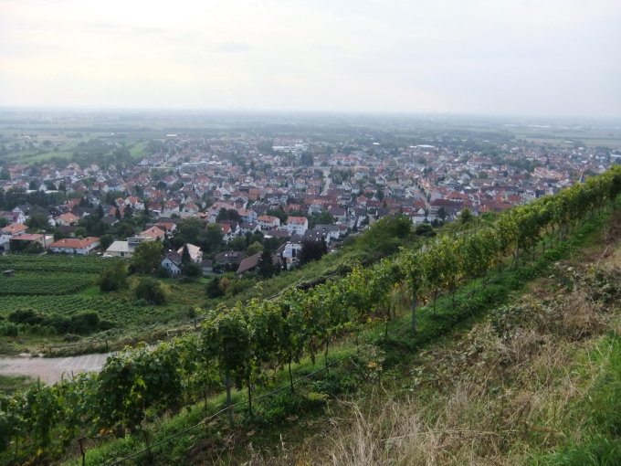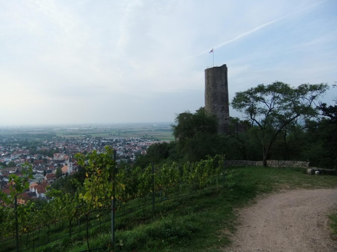 Bei Einkehr auf Terrasse im Innenhof der Burgruine Strahlenburg schöne Aussicht auf Schriesheim, den Neckar und bis nach Mannheim.