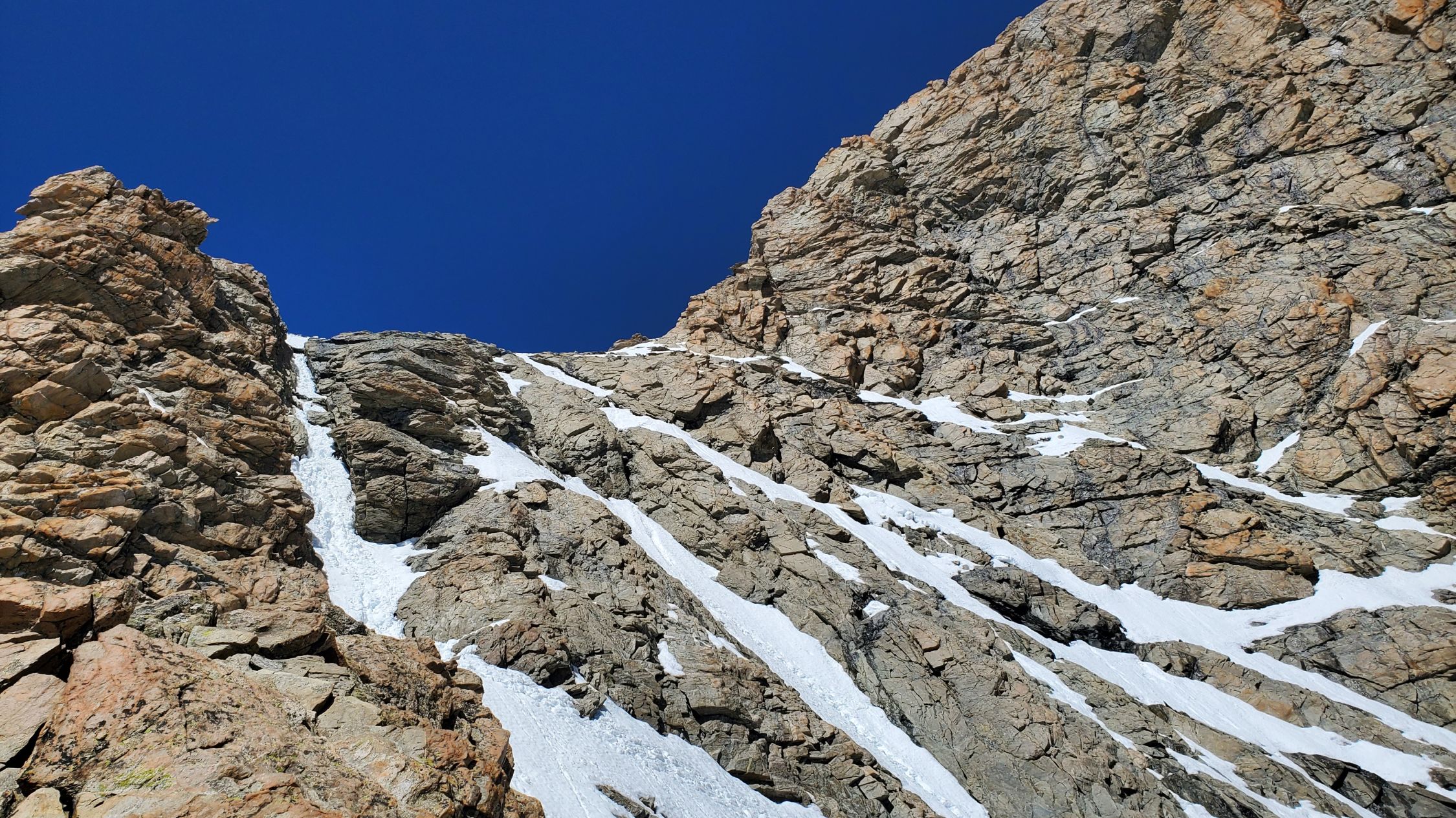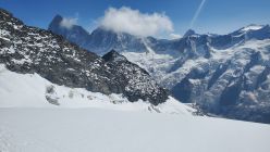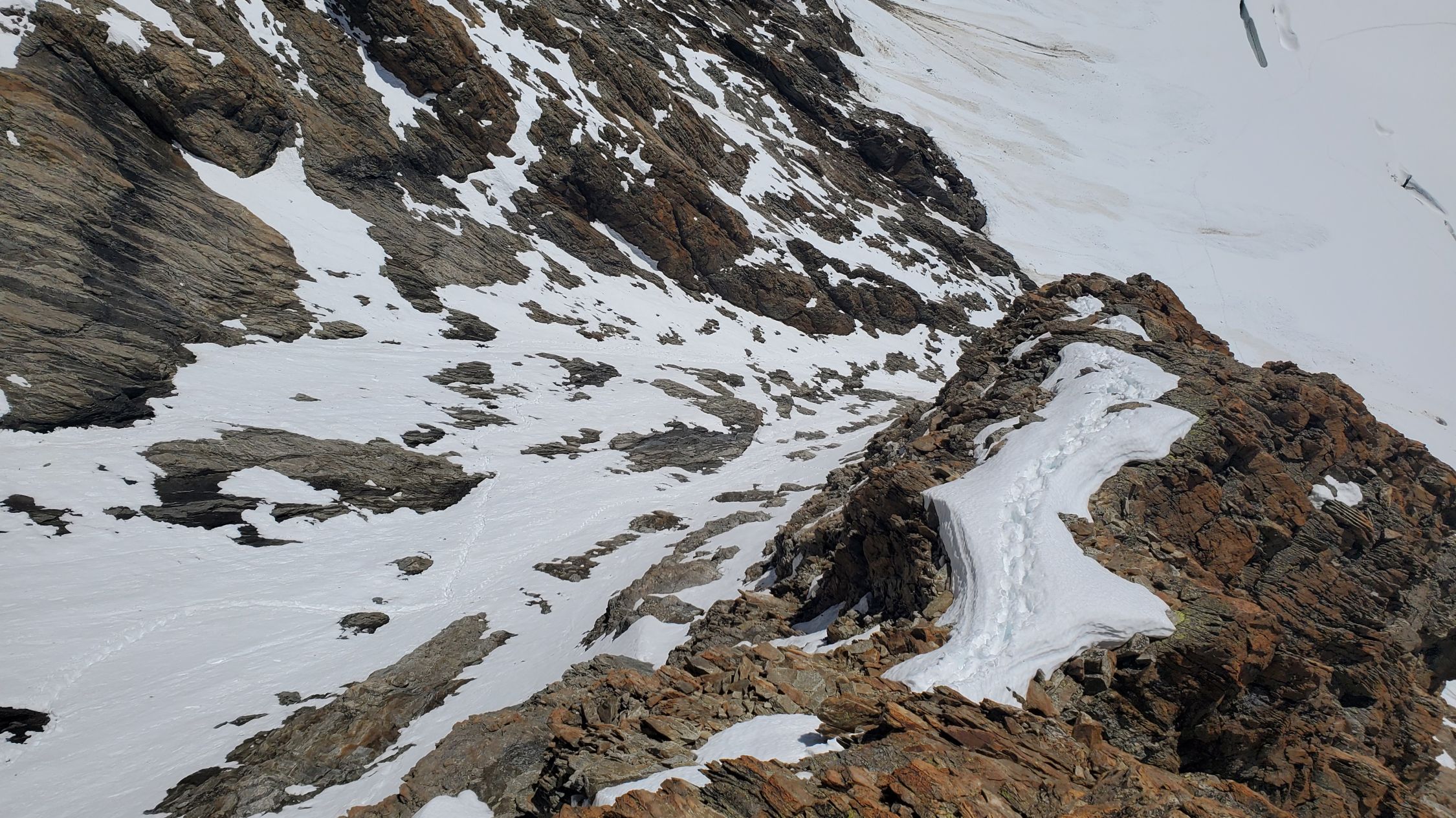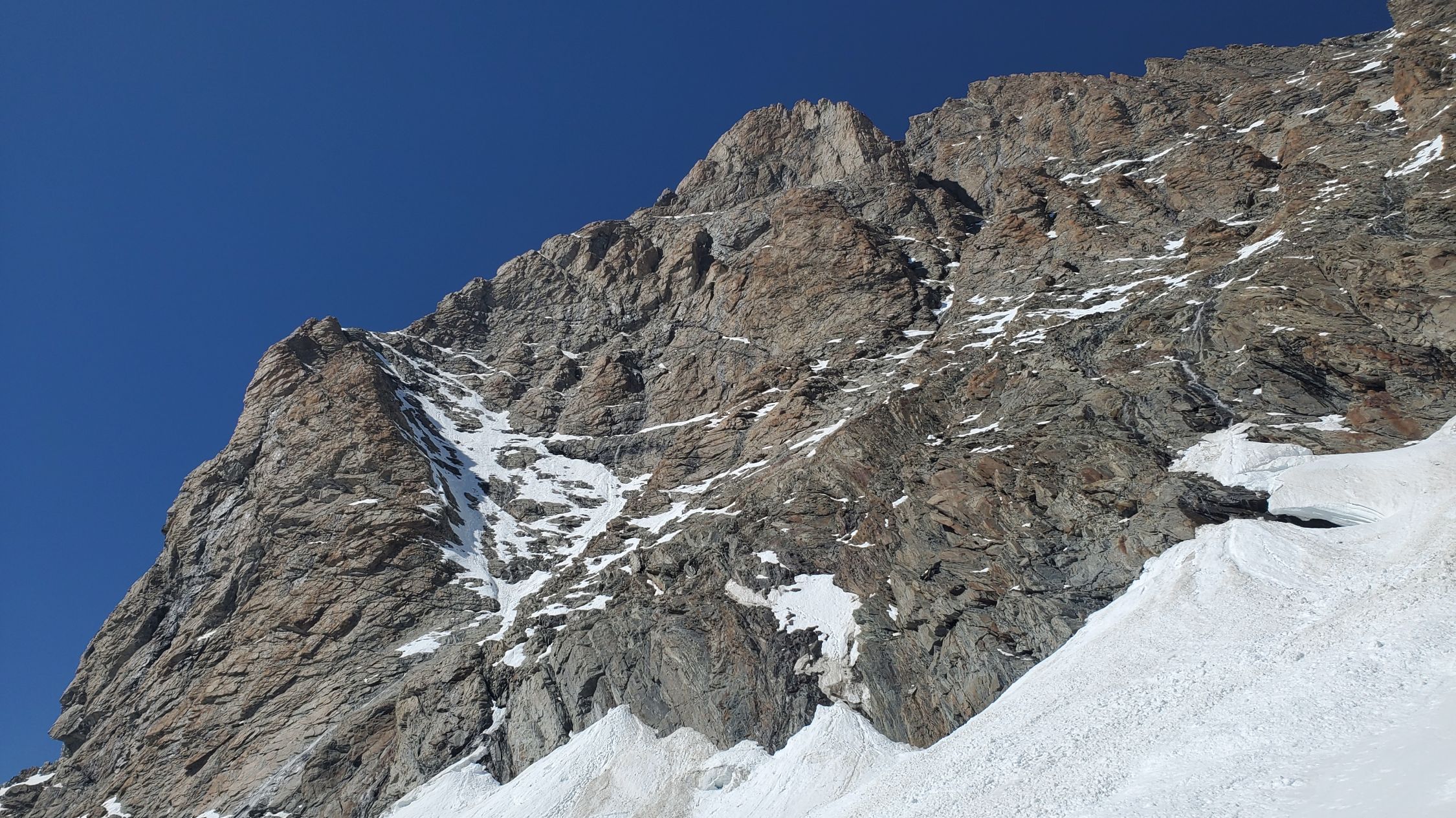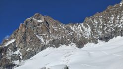 gute Verhältnisse, es hatte noch einiges an Restschnee, v.a. auf der Schulter - insbesondere im Abstieg könnte dieser aufgrund der Erwärmung heikel werden, ging bei uns aber ganz gut; Klettern nach dem Gletscher bis zum Gipfel ohne Steigeisen möglich, macht aktuell mit auch keinen Sinn; beim Einstieg anders als wie in der Routenbeschreibung weiter links in den Fels eingestiegen (hier gibt es auch für den Abstieg eine Abseilpiste);