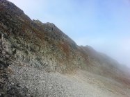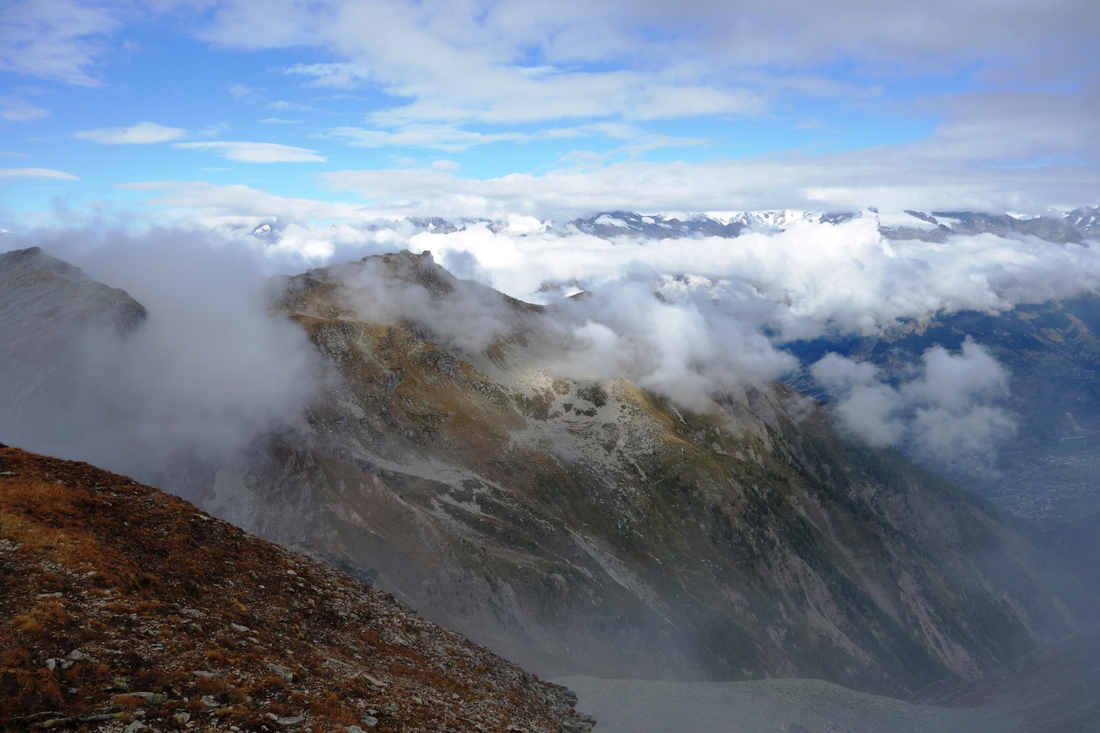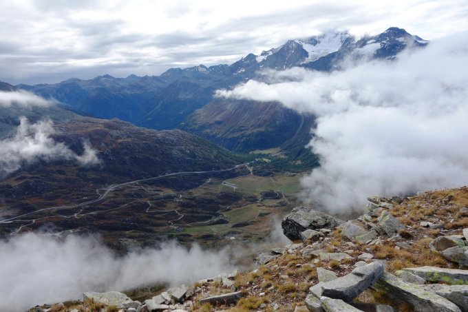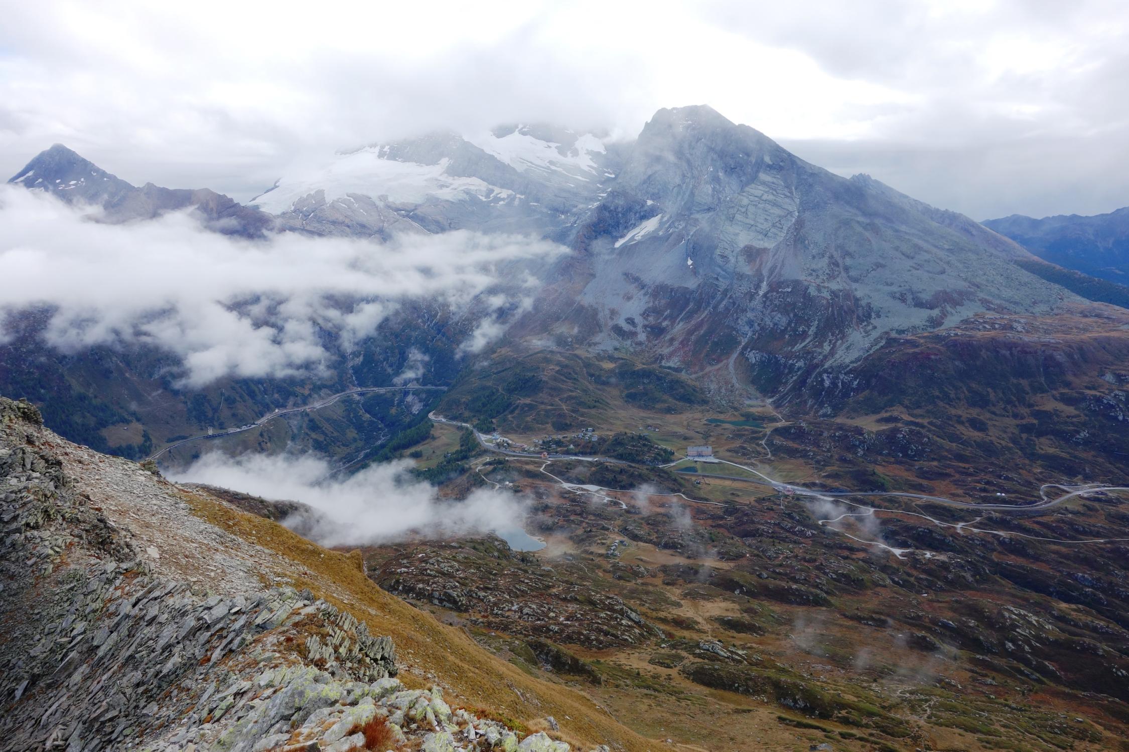Nebelfetzen verhinderten eine traumhafte Aussicht auf die Walliser Bergwelt, aber bevor der Regen endgültig einsetzte waren wir wieder zurück auf der Passhöhe.