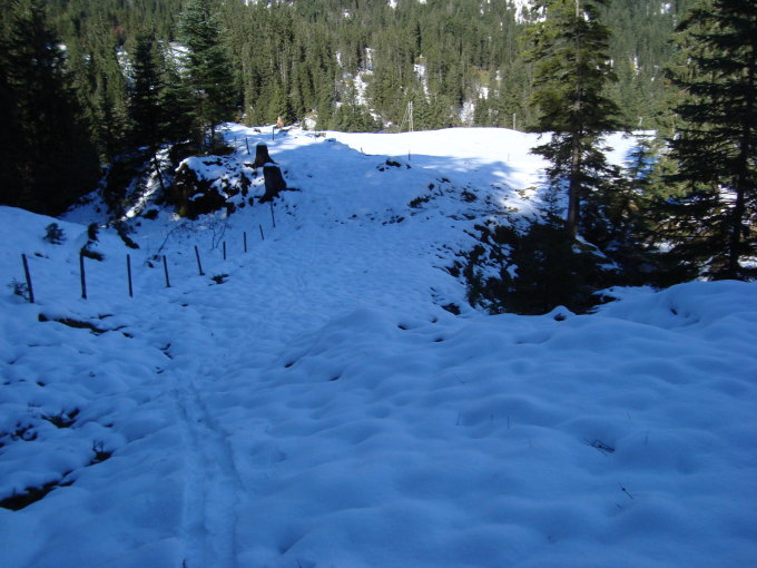 Die Schneedecke ab PP lud auf den ersten Blick nicht zum Skifahren ein. Probieren geht über studieren ,dachte ich mir und siehe da im Wald nach ca. 10min Skitragen, war anschnallen angesagt. Die dünne Schneedecke war oberflächig gefroren, so konnte man die Skier schön durch den Wald bergauf "navigieren". Heute und wahrscheinlich gestern waren keine weiteren Skitourengeher unterwegs. Das Spuren war aber im Gegensatz zum Winterhorn gestern völlig relaxed. Mit einer etwas vorrausschauenden und defensiven Fahrweise, konnte ich die Steinkontakte bei der Abfahrt, in Grenzen halten.