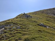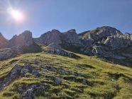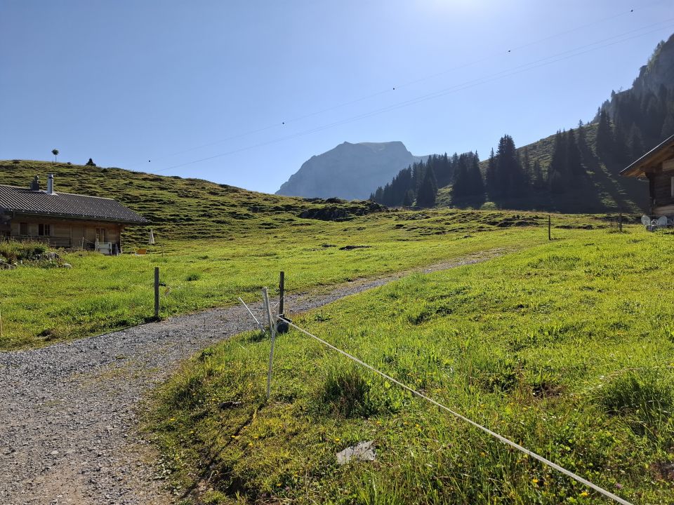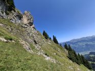Beim Aufstieg im Wiesengelände (Arven) Feucht und etwas schmierig durch Morgentau. Ab der Schlüsselstelle Fels trocken und Griffig. Auch das obere Wiesengelände ist trocken.