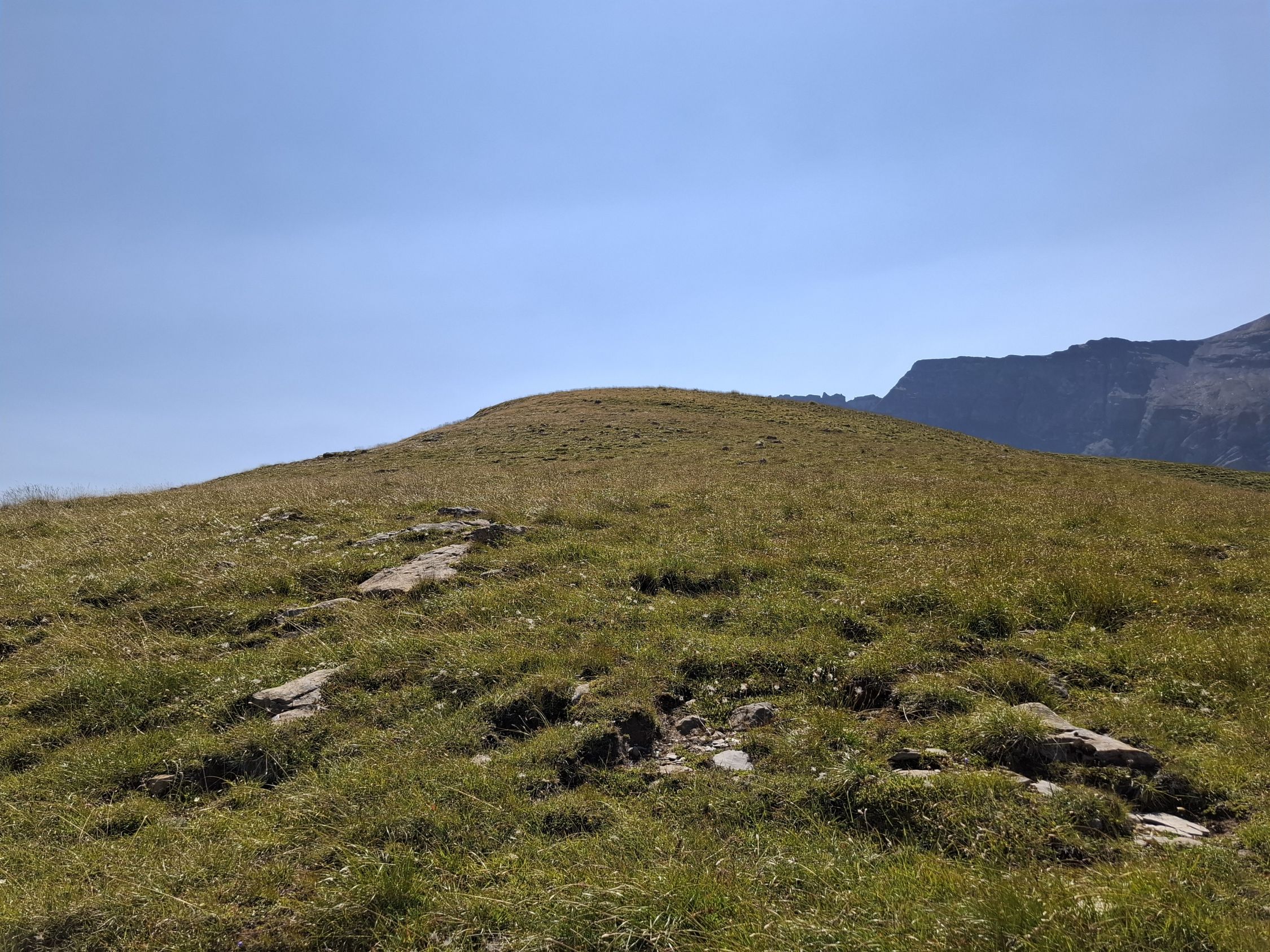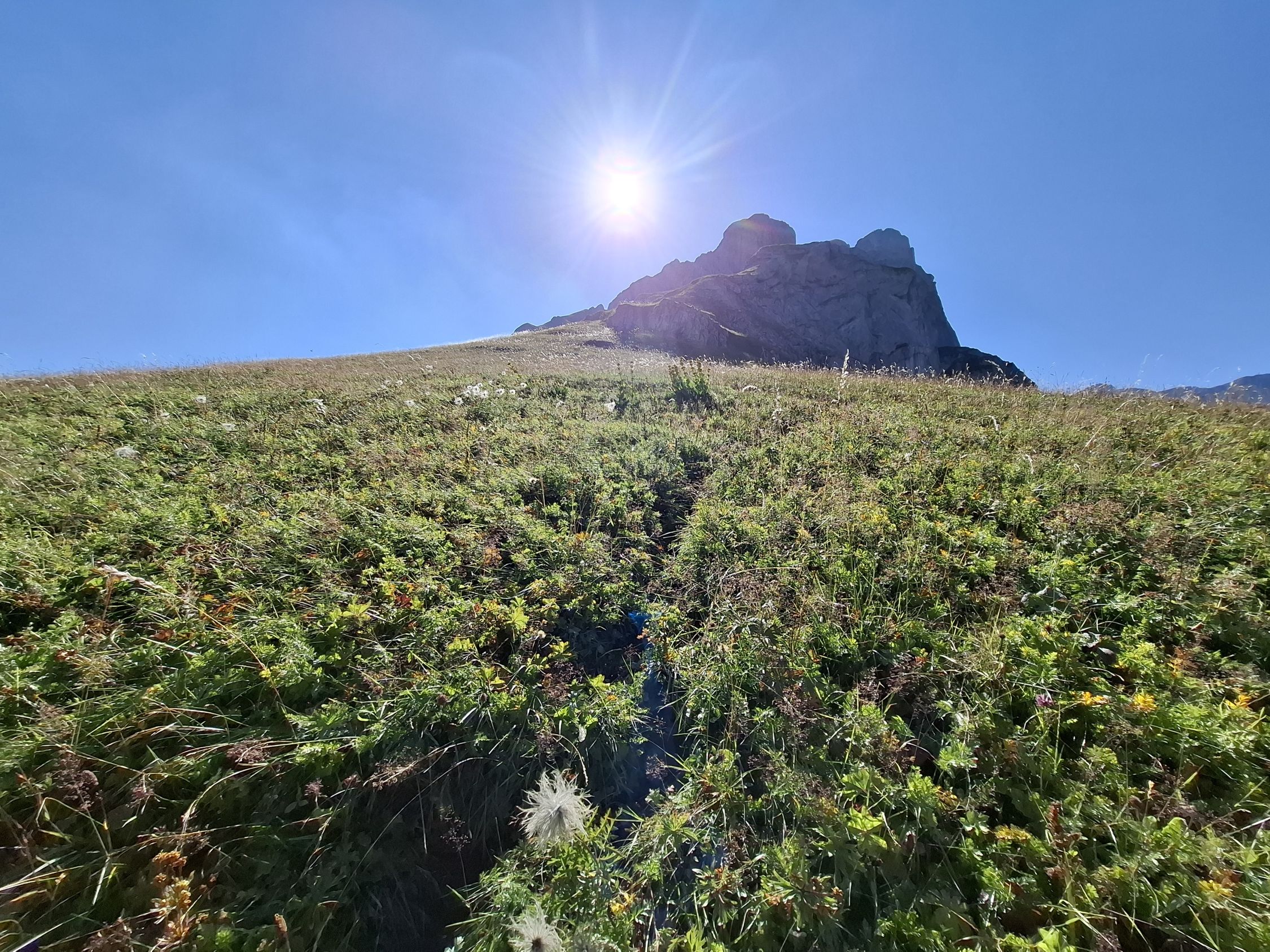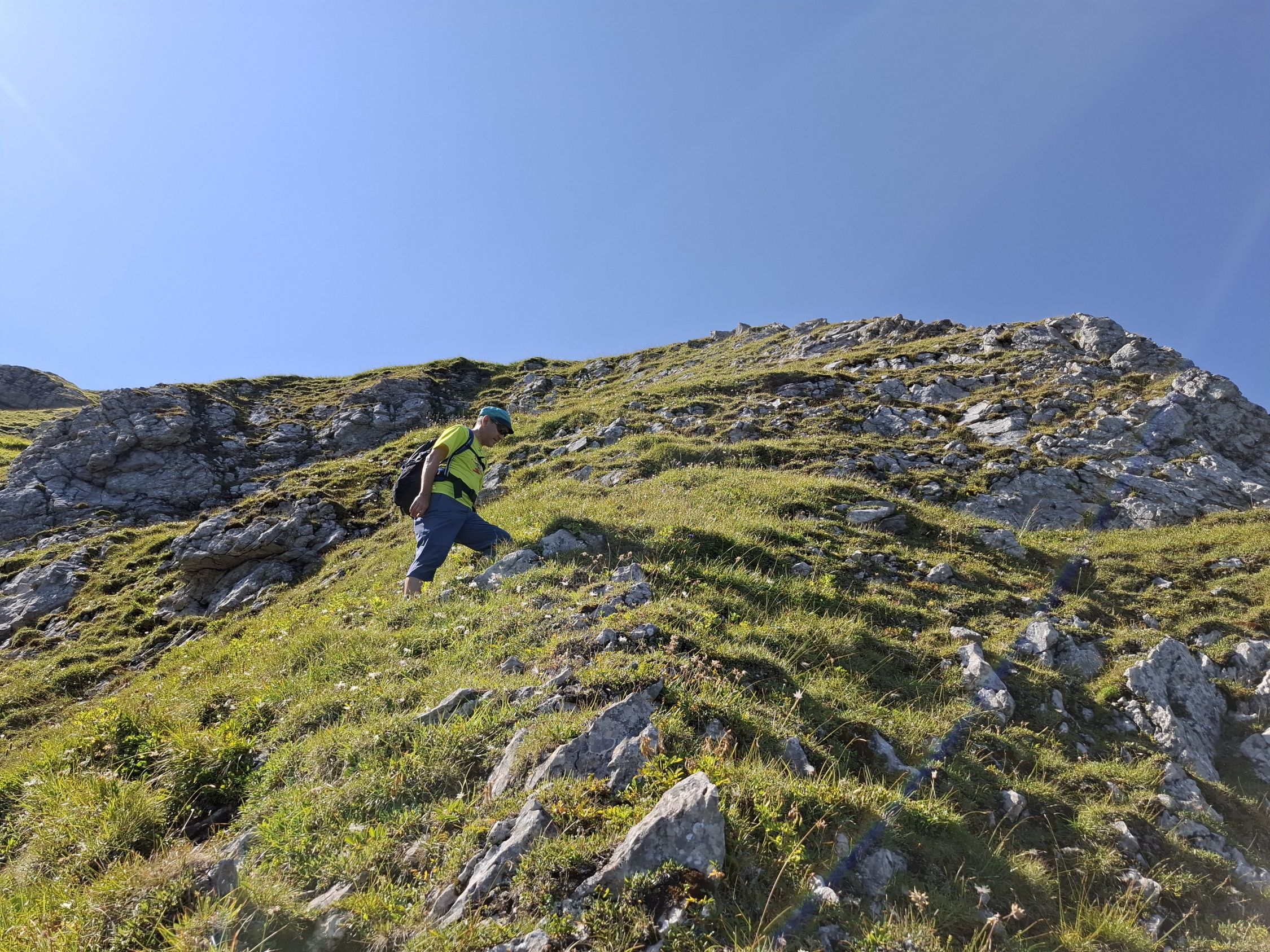 Schönes Wetter und trocken. Beim Abstieg teils angenehmer Wind. Heiss.