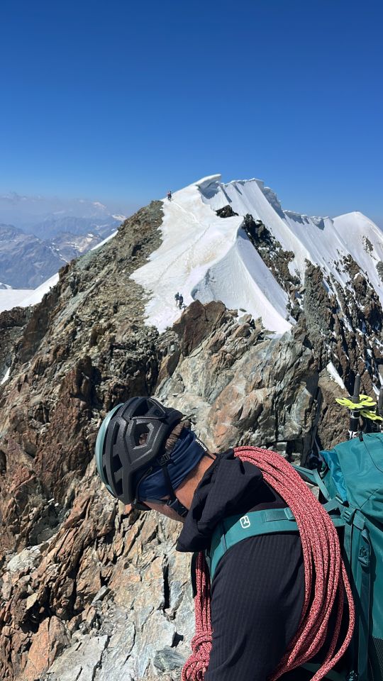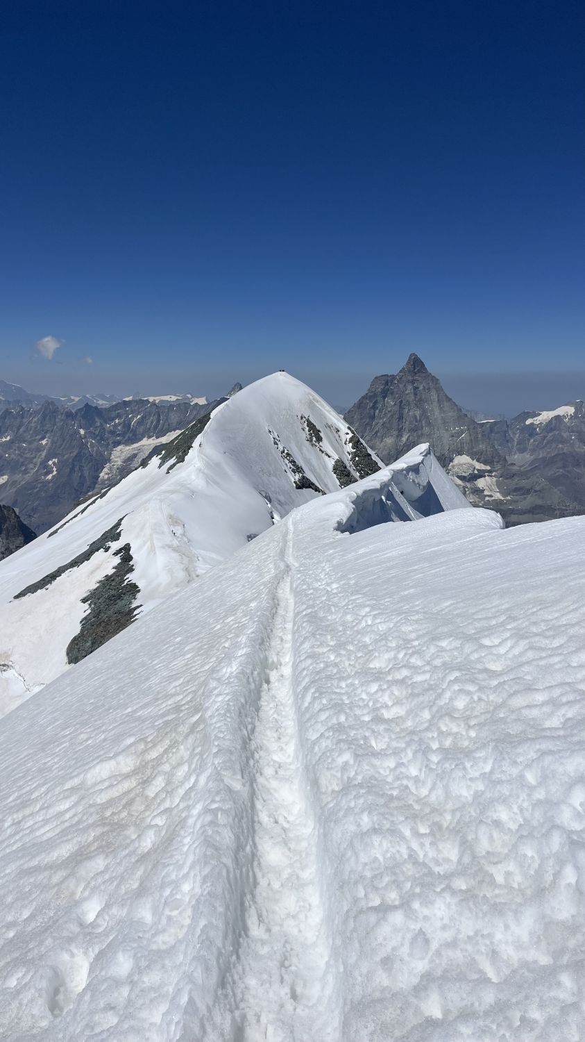 Letzter Firngrat vom Breithorn Centrale zum Westgipfel wie schon im Bericht vor wenigen Tagen erwähnt, ziemlich nah an den Wechten angelegt. Haben wir zügig passiert.