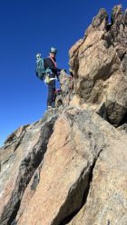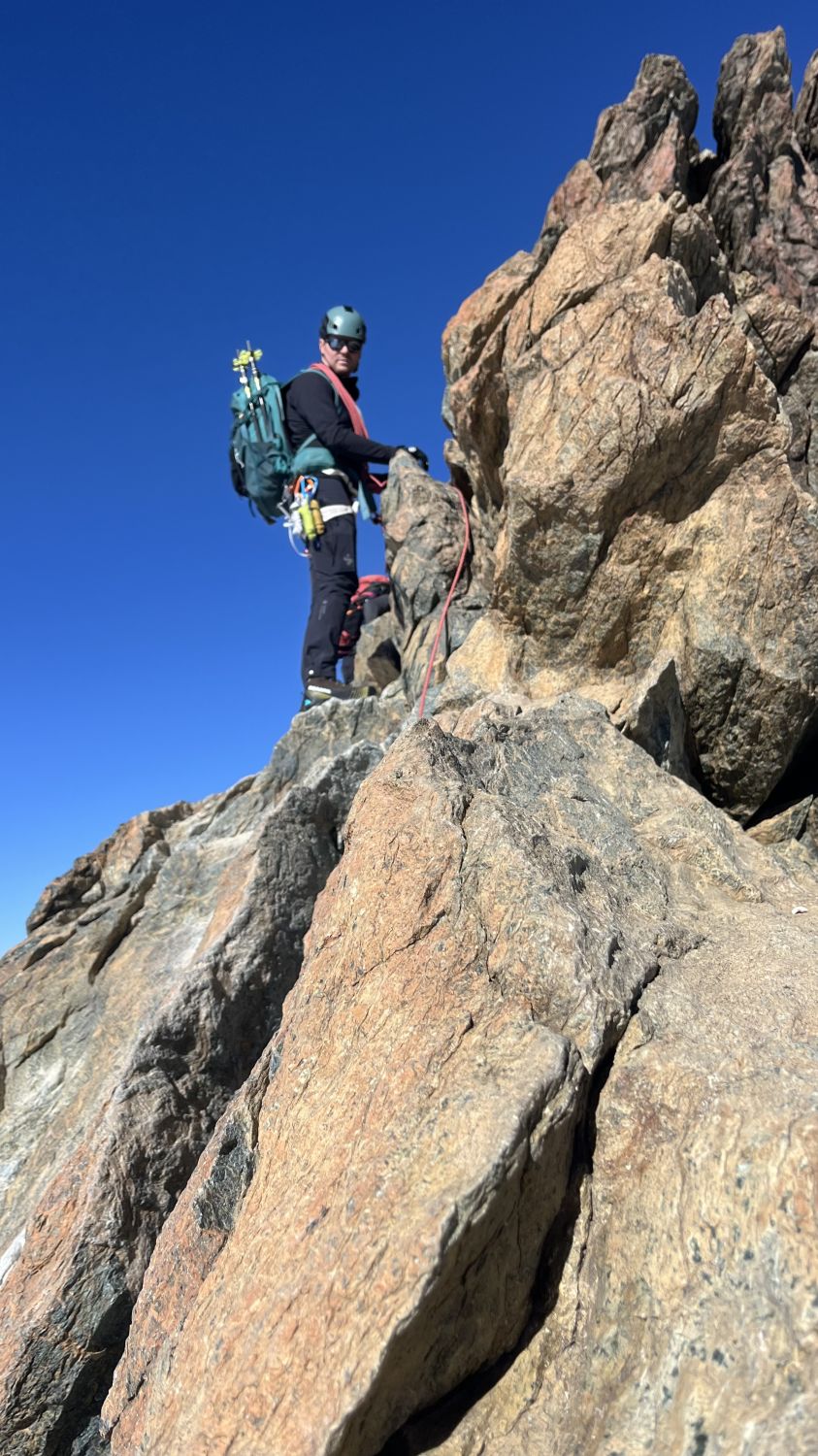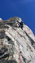 Grat schneefrei, ausser man wählt nicht die Klettervariante beim 1. Aufschwung (4b), sondern die Rippe unterhalb. Dann empfiehlt es sich das kurze Stück bis dahin die Steigeisen dran zu behalten, denn es müssen 10 Schritte auf harter Schneeunterlage im steilen Gelände gemacht werden.