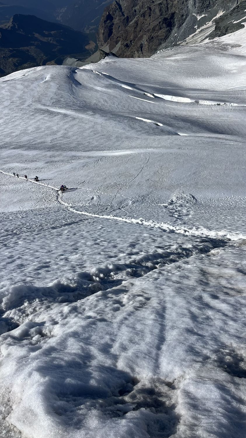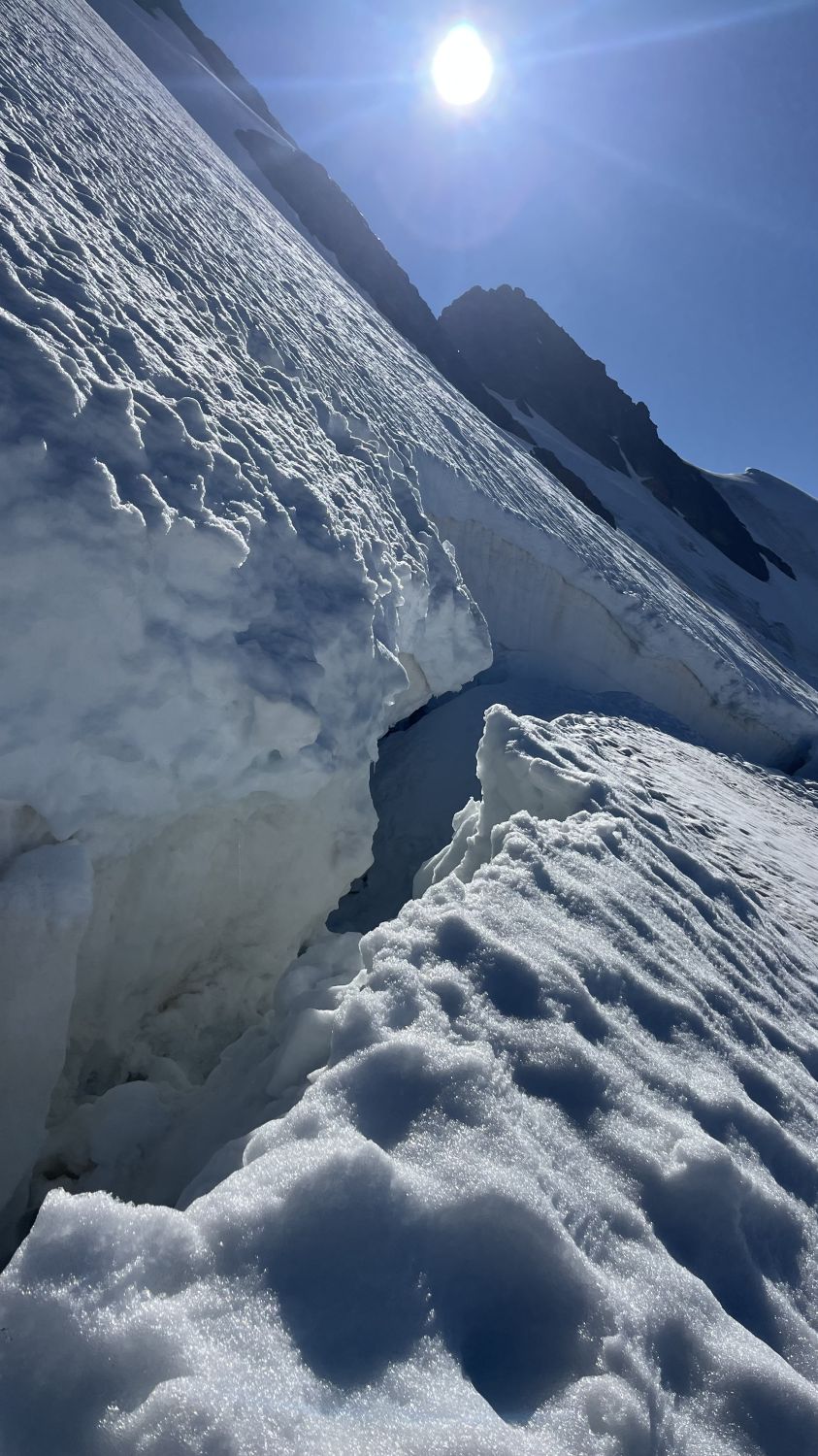 Aufstieg zum Breithornsattel teils mit hervorscheinendem Eis, bei guter Spur. Die grosse Spalte, die im Aufstieg liegt, klafft. Die Brücke, die aktuell genutzt wird, hätten wir zwei Stunden später nicht mehr betreten wollen :)