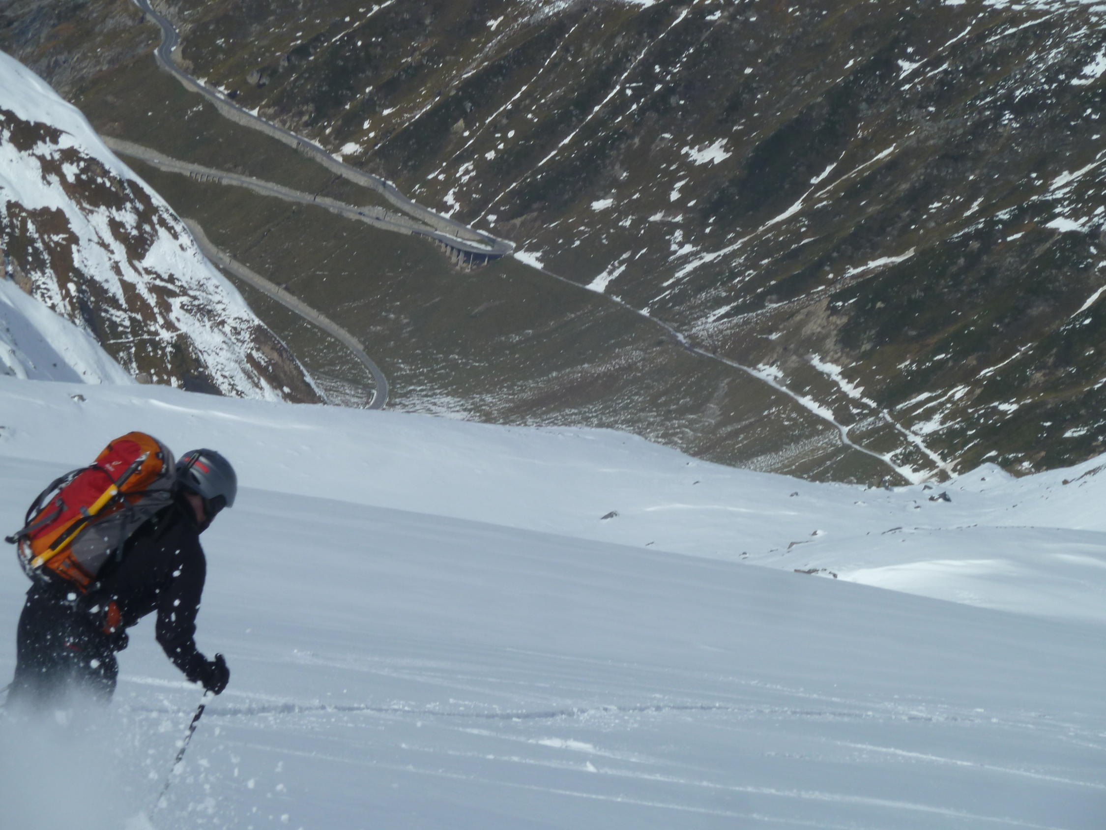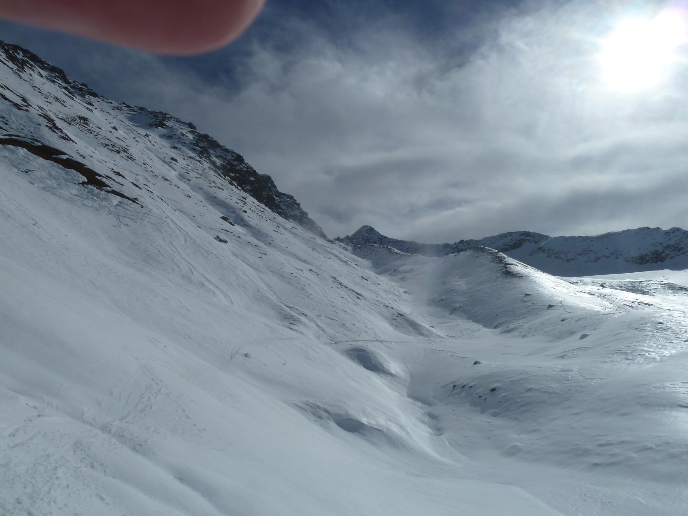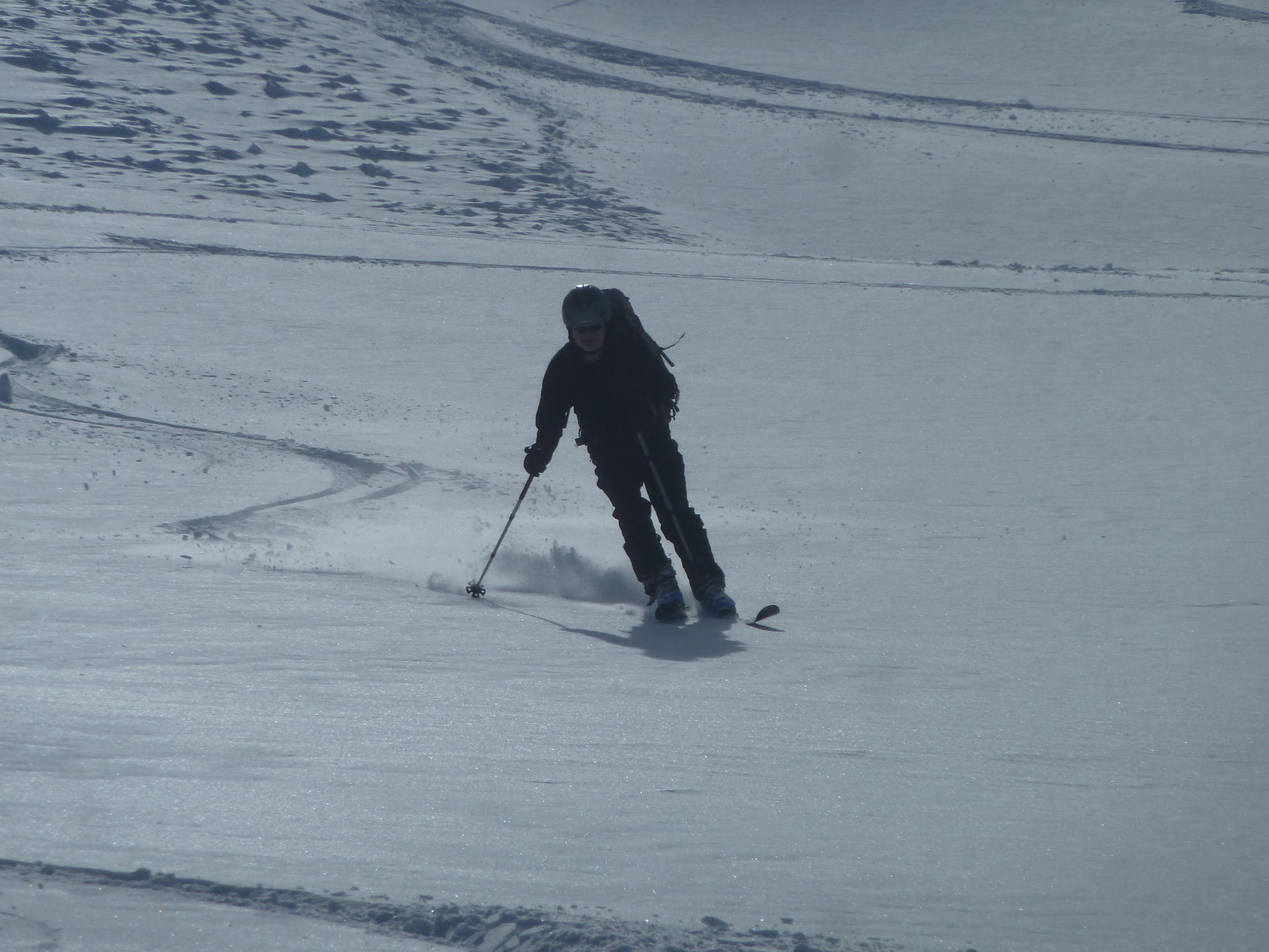 Abfahrt: Oben noch schwerer Pulver, sonst teils Deckel, teil tragbar.