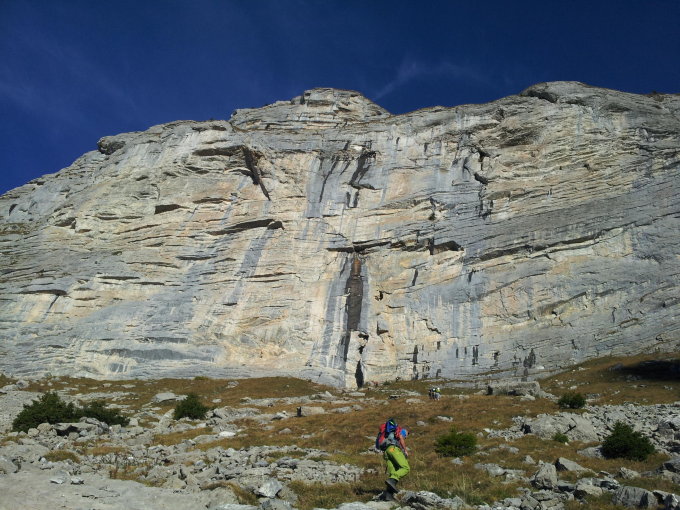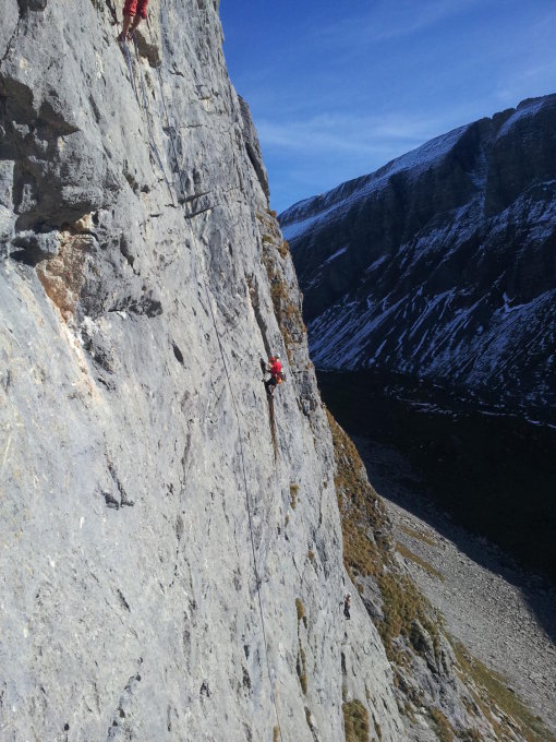 5. Kurze Länge in nochmals schönem Fels dem letzten Stand entgegen. Hier kann abgeseilt,oder die letzten Meter in einfachem Gelände zu einem Bor Haken geklettert werden. Von hier ca. 5o Meter horizontal in steilem Gras zur Abseilpiste der Zick-Zack gequeren.