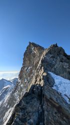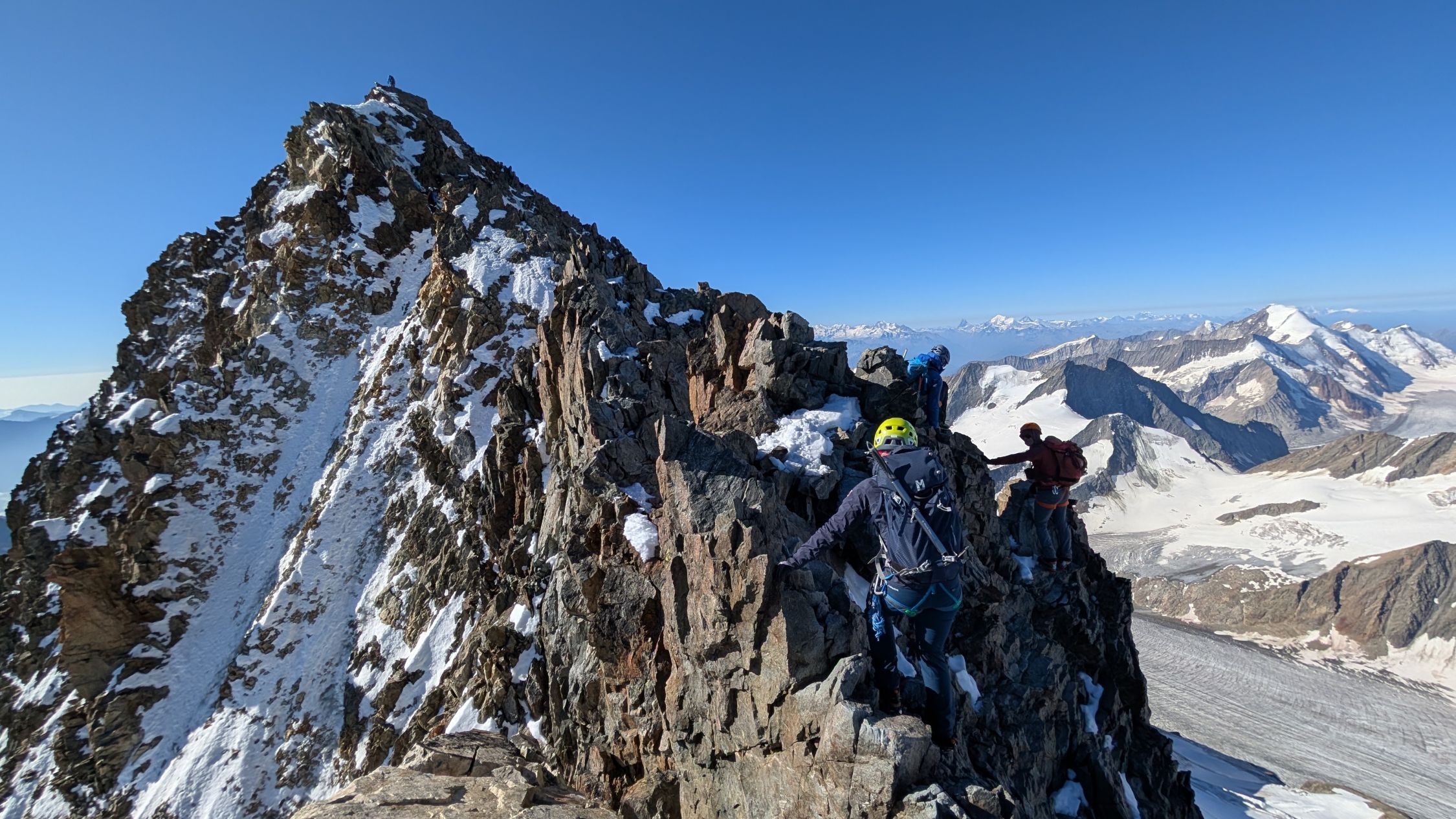 Grat vom Hugisattel aus wie im Bilderbuch. Steigeisen sehr empfehlenswert, da Firn und teilweise Eis auf dem Grat.