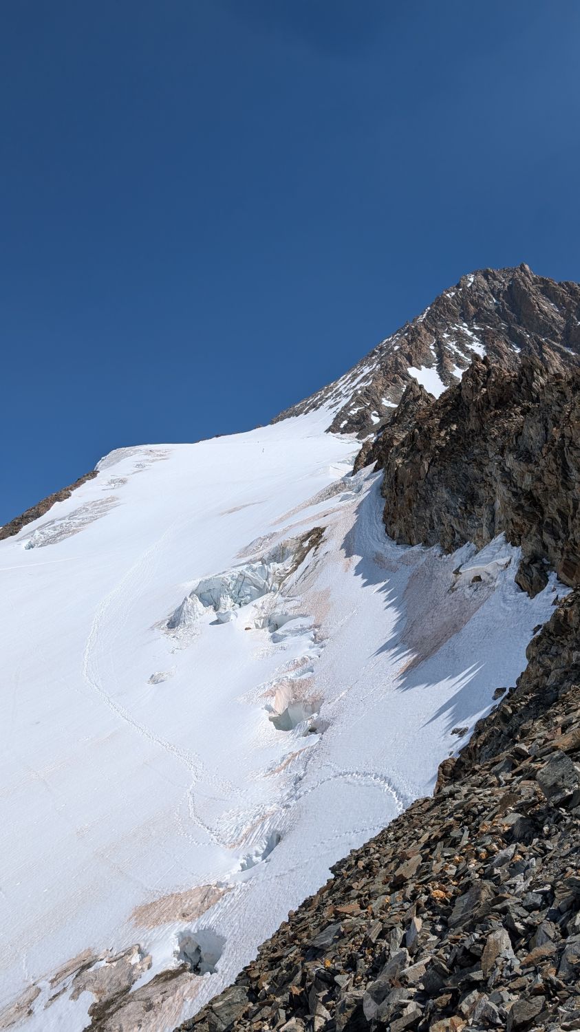 Aufstieg über Fieschergletscher problemlos machbar, da bis zur Finsteraarhornhütte aper. Viele Spalten, Umgehung aber problemlos.
