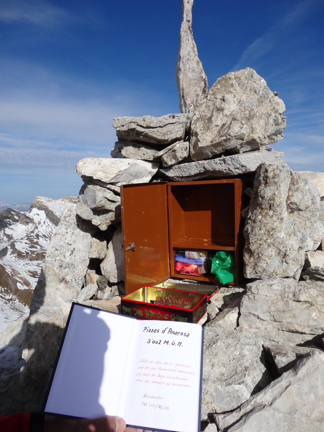 Grauhörner (3002m): Gipfelbuch und Steinmann Bau