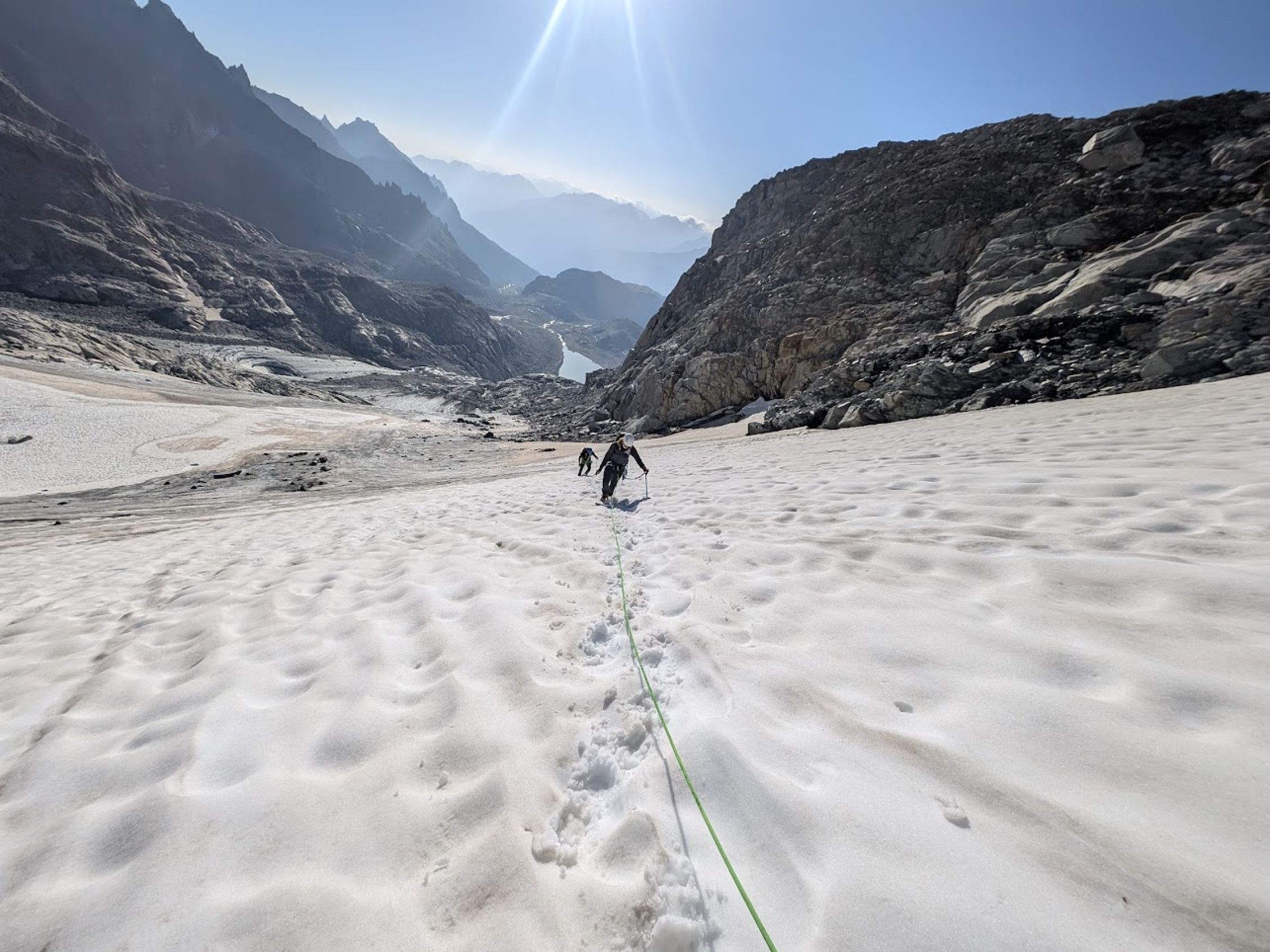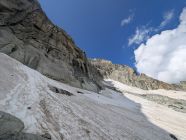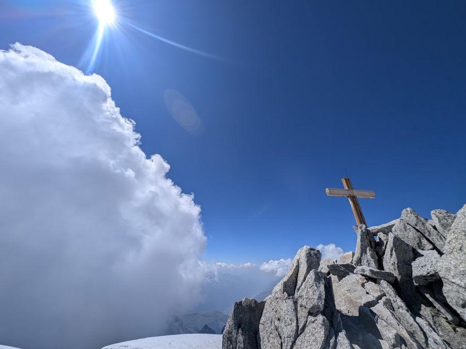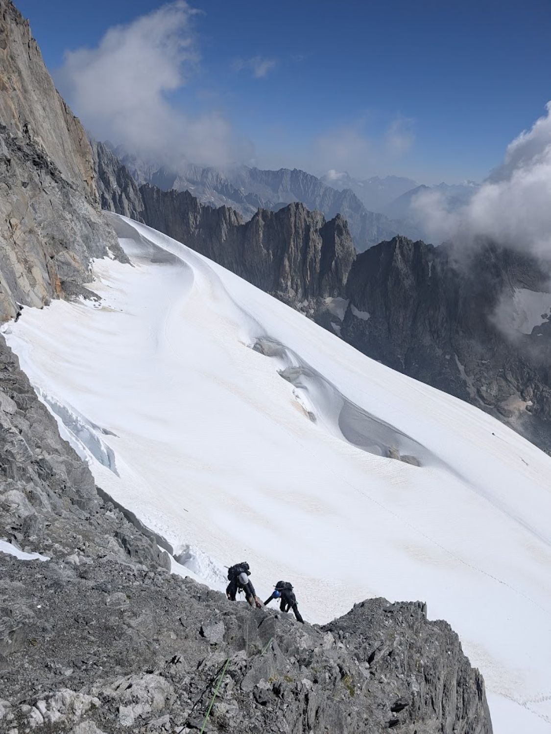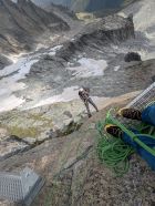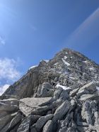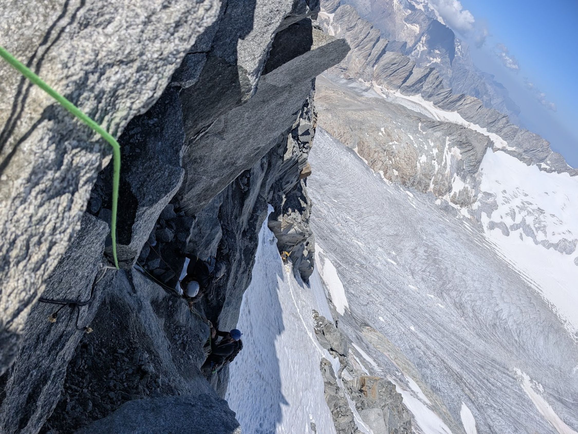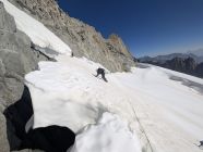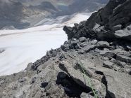 Gute Verhältnisse auf dem Tiefengletscher mit wenig Spalten, z.T. aber etwas weichem Schnee. Sind die selbstgesicherte, südliche Variante anstatt Aufstieg über den Klettersteig zum Grat hochgegangen. Spannend, aber vorsichtige Begehung erforderlich und wegen dadurch möglichem Steinschlag nur sinnvoll, wenn keine weitere Seilschaft dort unterwegs ist.