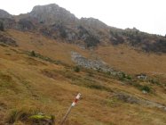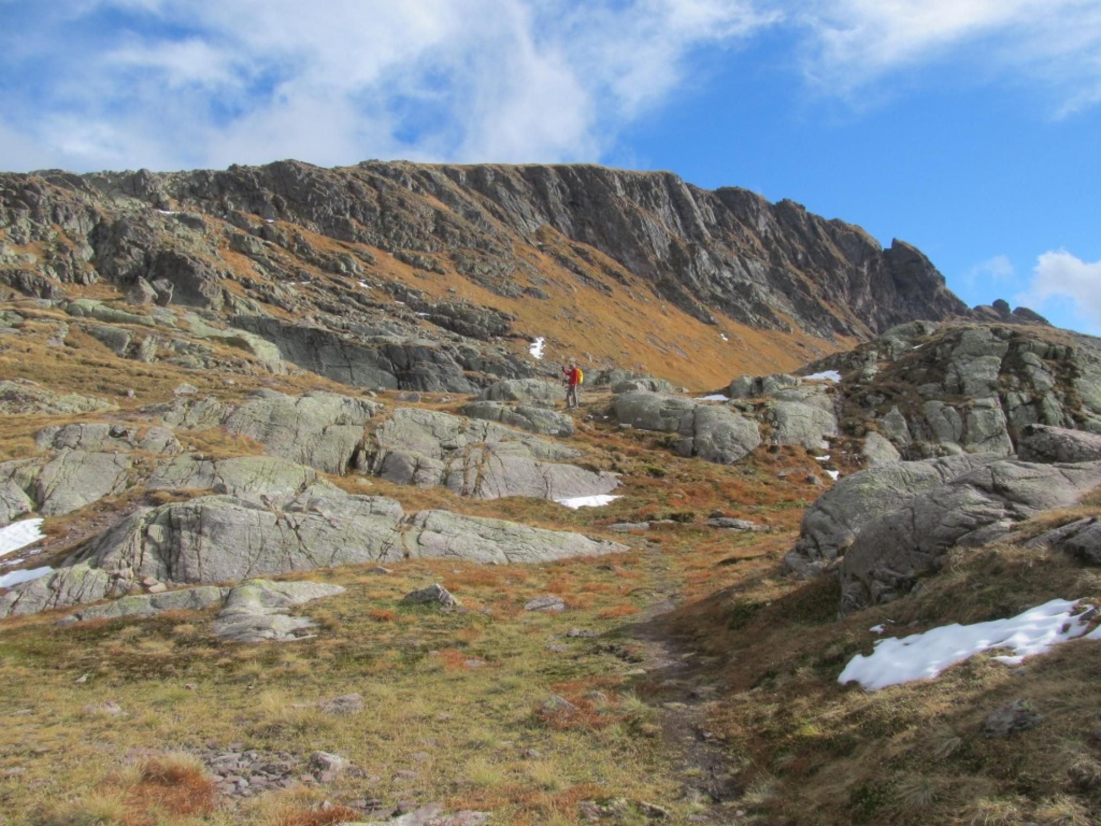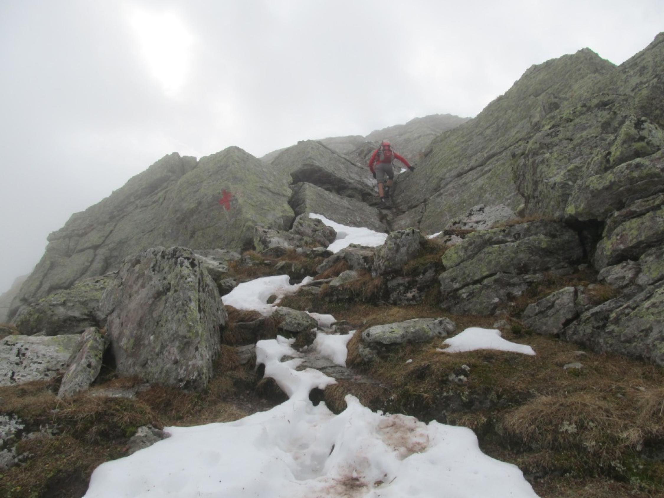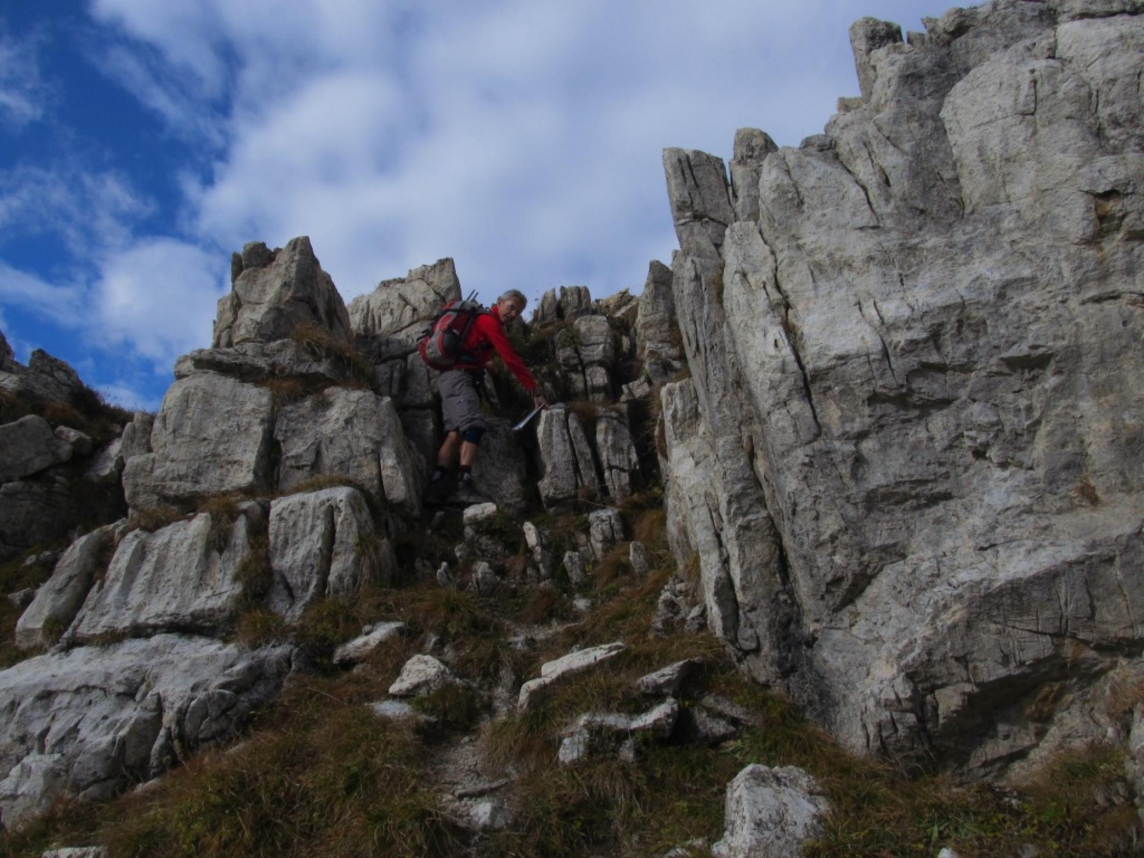 Der westseitige Abstieg unterhalb der Seen erfordert aufmerksames und geschicktes Gehen. Das Karstgelände, die glattgeschliffenen Kalkfelsen in Kombination mit dem nassen Boden macht das ganze glitschig.