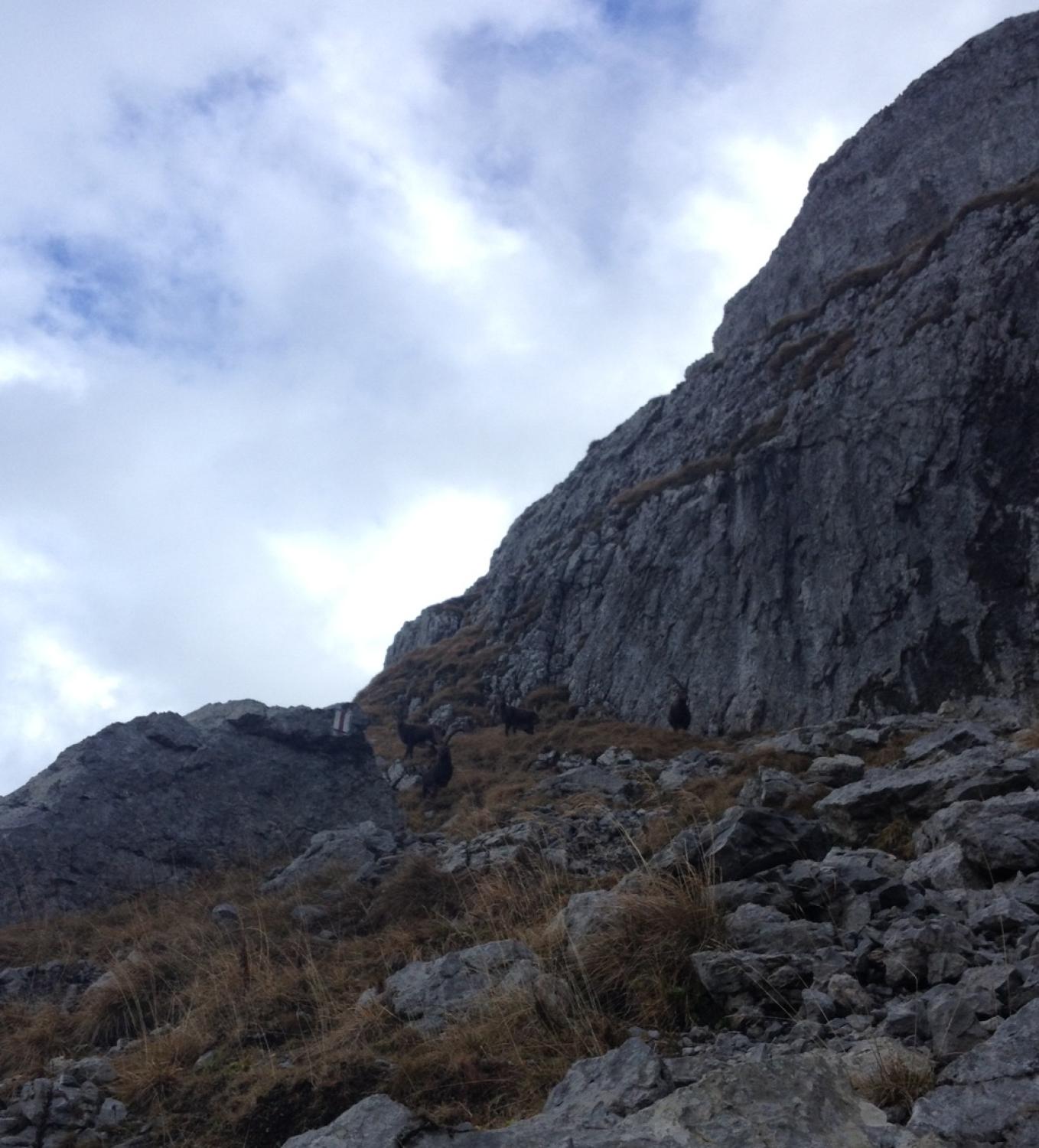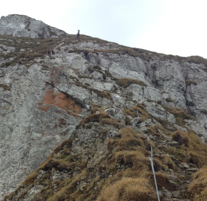 Teilweise rutschig. Beim Übergang vom Widderfeld zum Pilatus sind neue und deutlich mehr Sicherungsketten angebracht worden, quasi an allen etwas ausgesetzteren Stellen. Hätte es nicht unbedingt gebraucht, aber so auch bei Nässe für fast Jedermann problemlos möglich. Bei der Querung zuerst die Jungmannschaft, danach die Altmannschaft der Steinbockkolonie unterhalb des Widderfeld angetroffen, sonst niemand.