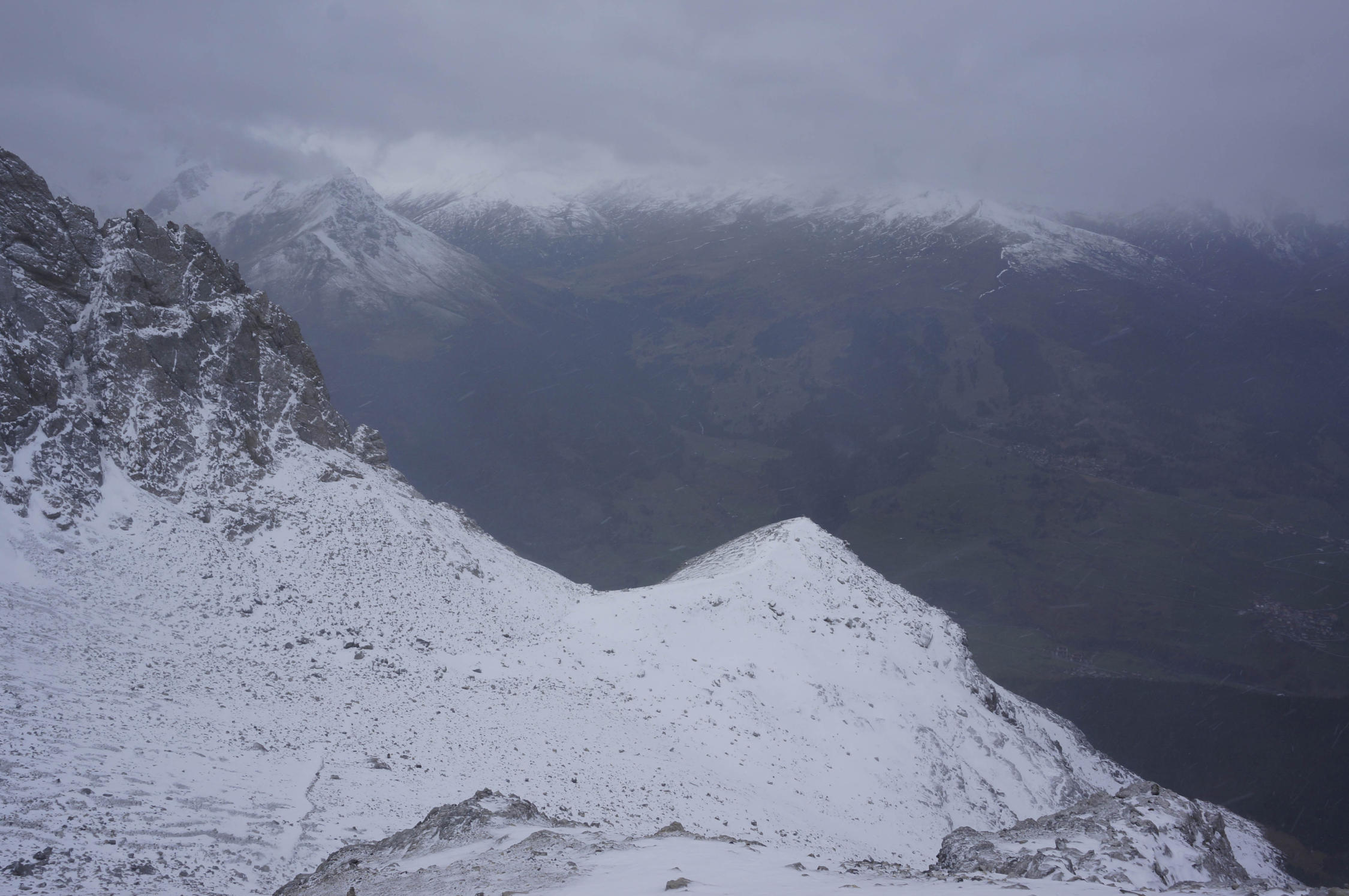 Umgekehrt wegen mehrfachem Ausrutschen auf Schnee-Mergel-Gemisch, in zunehmend heiklem Gelände, mit profilarmen Leicht-Bergschuhen, Stöcke und Steigeisen wären eine Option, hatte ich aber nicht dabei.
