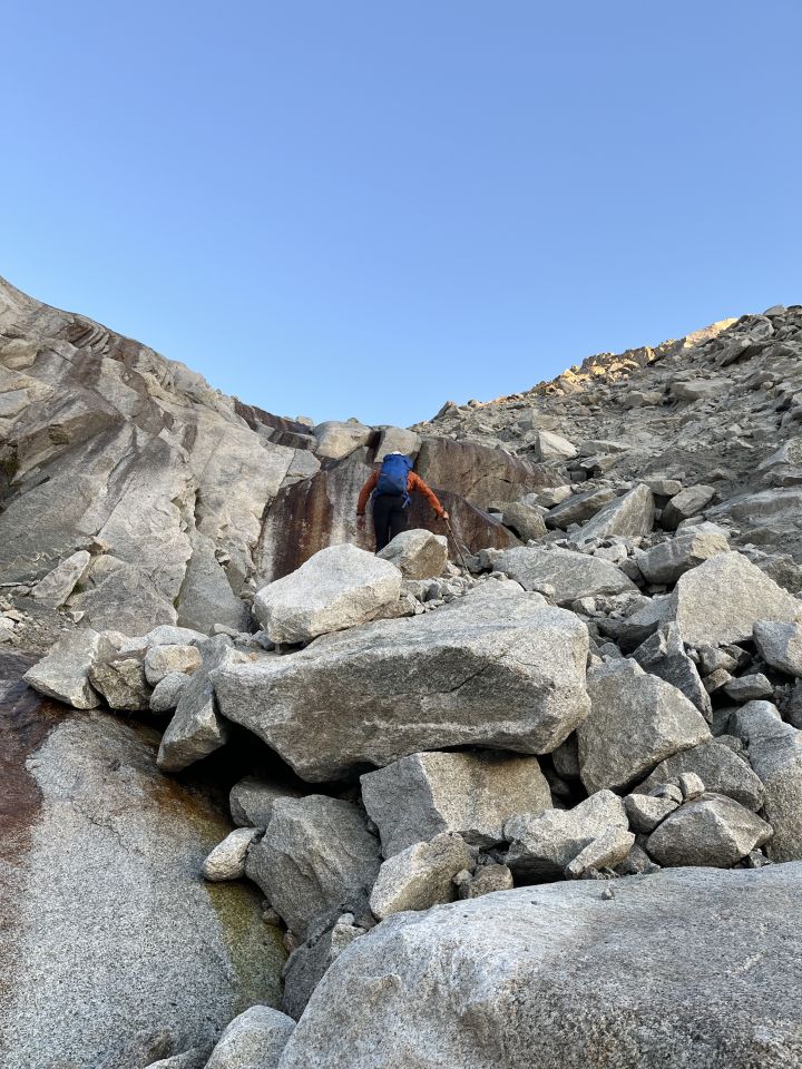 Der Steinschlag ist leider auch auf dieser Tour ein Dauerthema. Es passiert immer wieder, dass (späte) Seilschaften auf dem Westgrat einiges an Gestein runterschicken, während die schnelleren Seilschaften sich bereits im Abstieg in der Ostflanke befinden. Auch am Grat selbst wackelt einiges. Wir haben leider Ausbrüche grösserer Brocken vom Grat in die Westflanke erlebt.