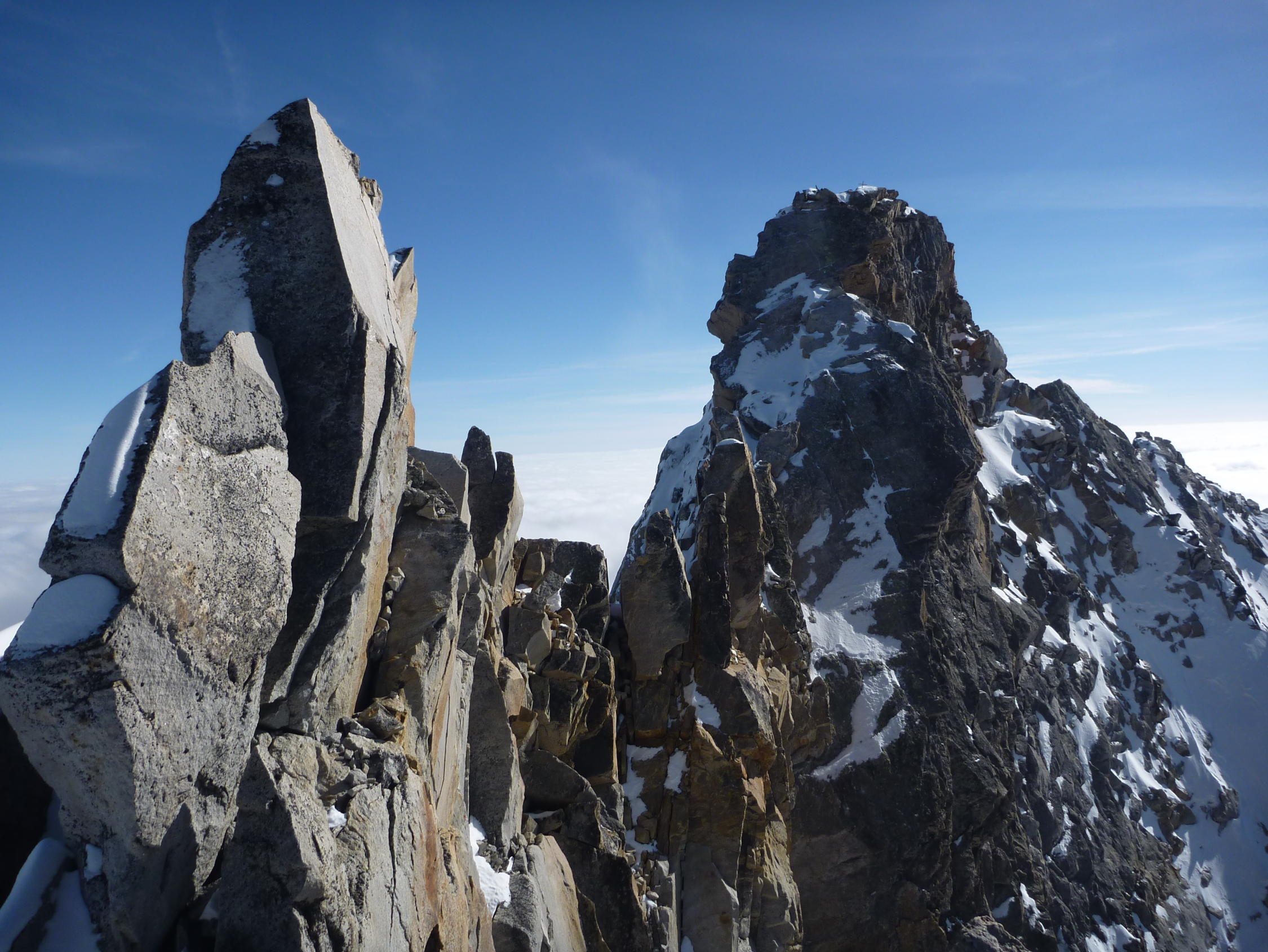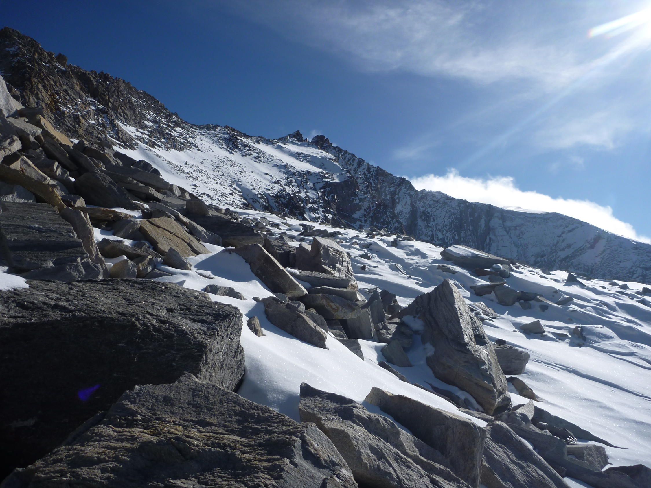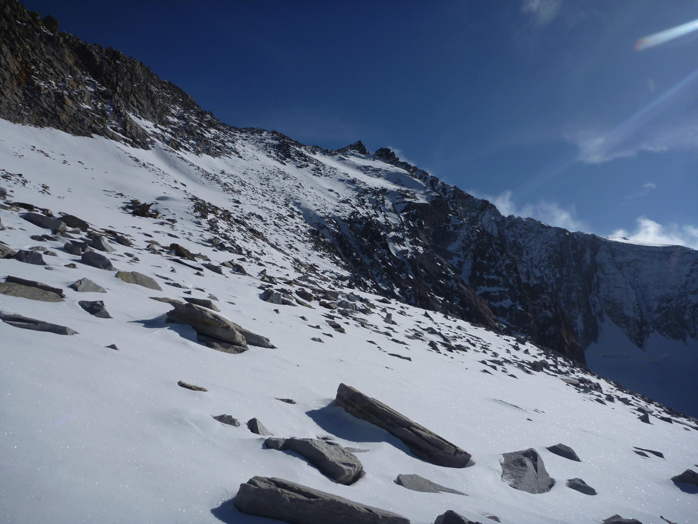 Im Wesentlichen sehr guter Trittschnee auf den Geröllfeldern. Felsen am Grat weitgehend schneefrei.