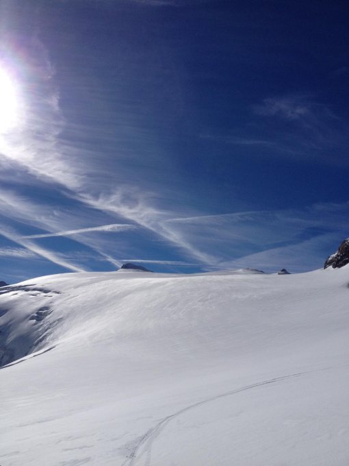 Der Gletscher ist vollständig mit Schnee bedeckt, allfällige Gletscherspalten sind daher nicht zu erkennen. Im oberen Teil ist der Schnee fest bis hart (je nachdem wie früh man unterwegs ist) jedoch sehr griffig. Im unteren Teil wird die oberste Schicht gegen Mittag ziemlich sulzig. Die Schneeverhältnisse sind insgesamt ideal für eine tolle Skiabfahrt. Stand: Das Fixseil beim Felsriegel ist an der zweiten Halterung lose.