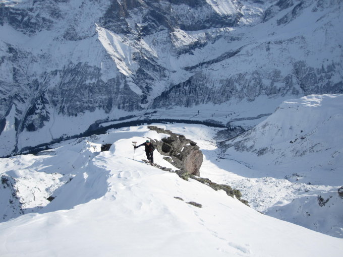 Bis Erbsalp relativ wenig Schnee, doch auf der Strasse gut fahrbar. Danach stark zunehmend. Bis zur Südhangquerung gut eingeschneit. Die Querung durch die Sonneneinstrahlung sehr gut verfestigt. Die kurze Steilstufe noch mit den Ski begehbar, da sich noch keine Wächte gebildet hat. Der oberste steile Südhang ist wieder sehr gut verfestigt. Im Gipfelaufbah (Fussaufstieg) noch sehr wenig Schnee und verfestigt, dadurch nicht als kritisch eingestuft.