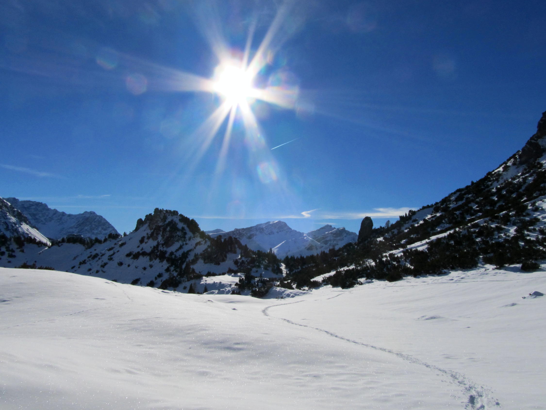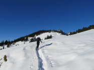 Von Anbeginn sonnig. Den Nebel haben wir im Tunnel zum Saminatal hinter uns gelassen. In Malbun ca. 20 cm Schnee, der auf dem Wanderweg Richtung Saasförkle wegen der Sonneneinstrahlung vom Vortag teilweise gefroren bzw. gedeckelt war. In Schattenlagen und insbesondere nördlich des Stachlerkopfs pulvrig und bis ca. 45 cm hoch. Im sonnenexponierten Schlussaufstieg vom Rossboda zum Schöneberg war der Schnee nass. Für Skitour liegt derzeit zu wenig bzw. für Abfahrt wenig geeigneter Schnee, wobei der Schönberg sich ohnehin mehr für Schneeschuhtouren anbietet.