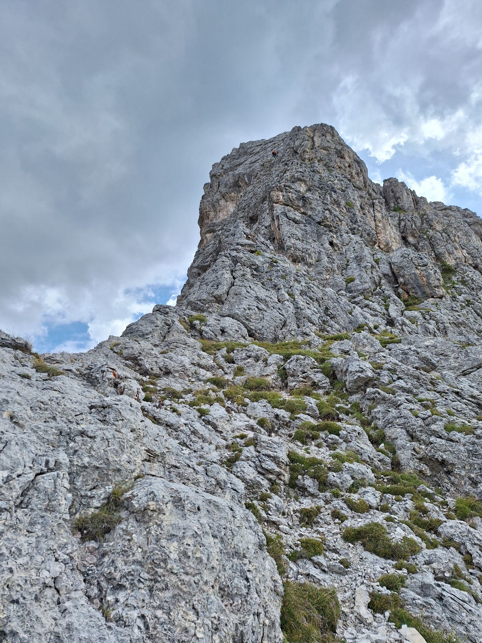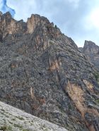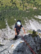 13 SL – zuerst in leichtem Gelände in Richtung eines Felsturmes, der rechts eine abgespaltete Platte hat. Man geht in der Rinne/Kamin hoch zum Kopf der Platte und dann wieder nach links zu einem Absatz auf der Kante mit Ringhaken (45m, III-)