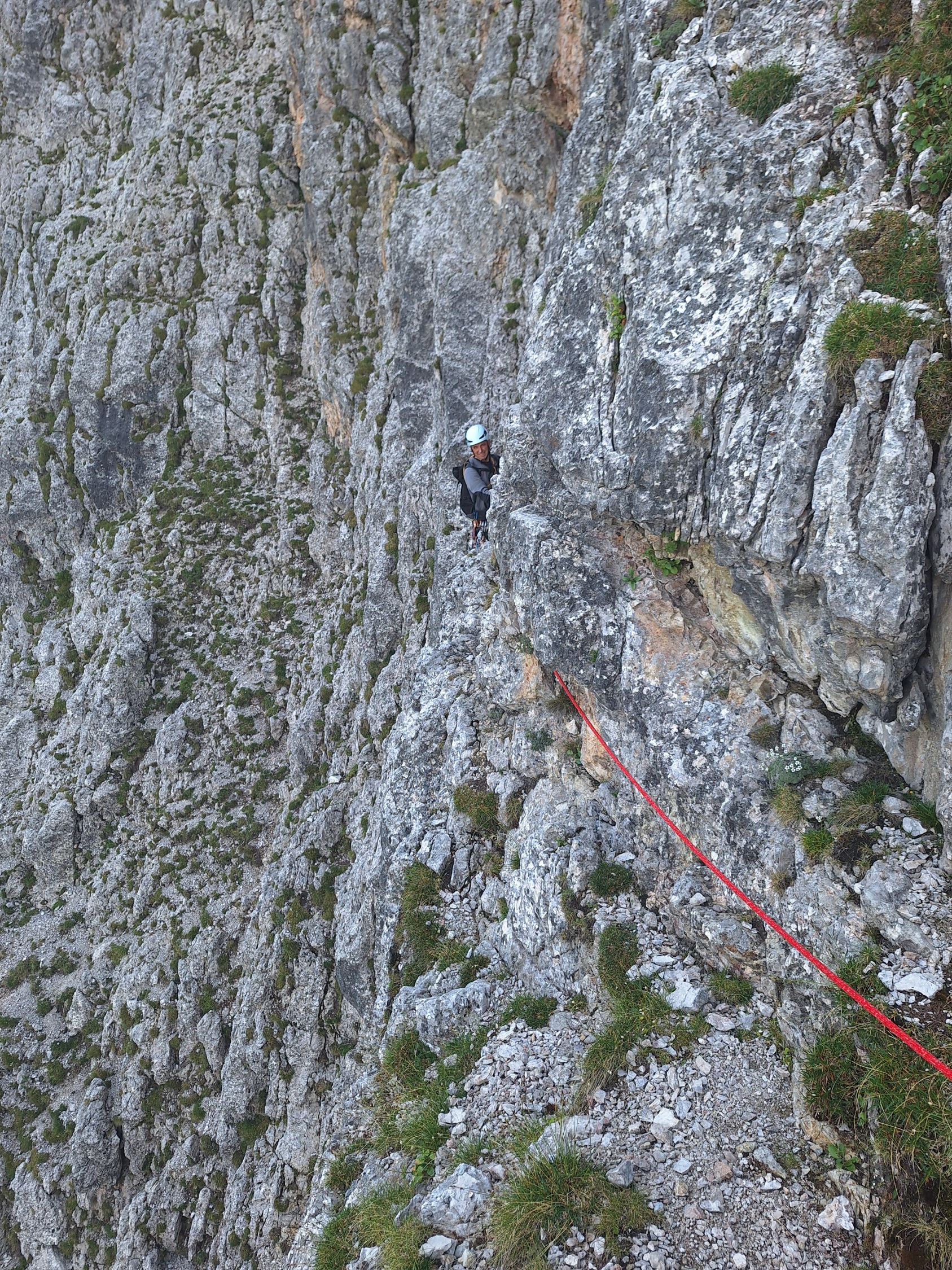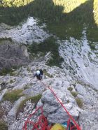 14 SL – vom Standplatz auf Band kurz nach links um die Kante, und dann immer links der Kante über gestuftes Gelände, zum Schluss über Schrofen hoch zum letzten Standplatz mit Ringhaken (55m, II)