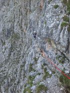 3 SL – zuerst über gestuftes Gelände zum Beginn einer Verschneidung. Durch die Verschneidung bis kurz vor ihrem Ende hoch. Hier wird die Verschneidung durch eine von links kommende Leiste unterbrochen. Hier beginnt auch die Querung nach rechts. Der Einstieg in die Querung beginnt zuerst mit eine abschüssigen Griffleiste, aber danach werden die Griffleisten immer besser. Nach ca. 15m Querung erreicht man den Standplatz bei einem massiven Köpfl (35m, IV- / Bemerkung: ja die Querung ist ausgesetzt und sieht schwieriger aus als diese ist.)