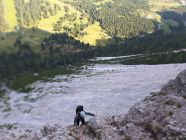 6 SL - vom Baum wieder nach links zur Kante und dann über diese hoch bis man auf eine senkrechte Wandstelle mit eine Bold (etwas rechts der Kante) trifft. Über diese Wandstelle mit Riss hoch zum nächsten Absatz mit Ringhaken (30m, IV / Bemerkung: subjektiv betrachtet dürfe diese Wandstelle die eigentliche Schlüsselstelle sein. Ob diese noch als IV, bzw. IV+ bewertet werden kann, möge jeder selbst entscheiden).