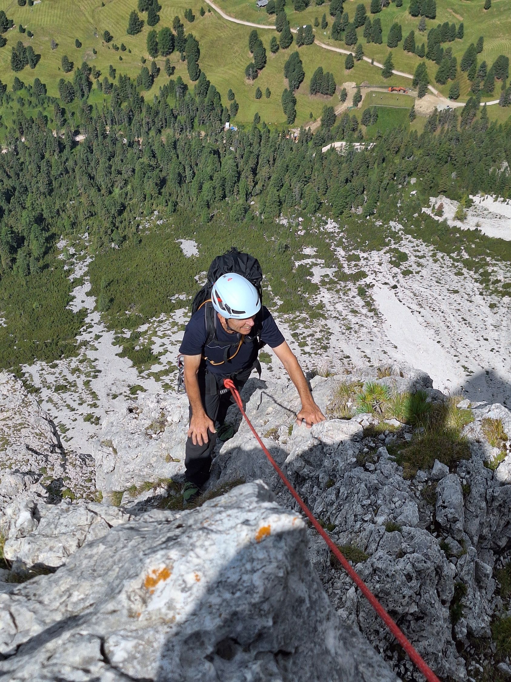 8 SL – nun geht es über Schrofen hoch bis zum nächsten Standplatz mit Ringhaken bei einem Block am Fuß der Wand (55m, I)