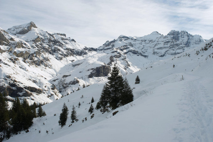 Wetter: Heute Nebelobergrenze bei Tschingel auf 1200m ü.M., darüber sonnig mit durchziehenden Schleierwolken. Unterhalb der Nebelobergrenze heute Morgen um -3°C, darüber Temperaturen im positiven Bereich. Auf dem Gipfel praktisch windstill. Jahreszeitbedingt fantastisches Licht mit langen Schatten! Der Wiederaufstieg nach Grüenematti lohnt sich besonders, da der dort in der Bundstockroute liegende Neuschnee grösstenteils noch pulvrig ist.