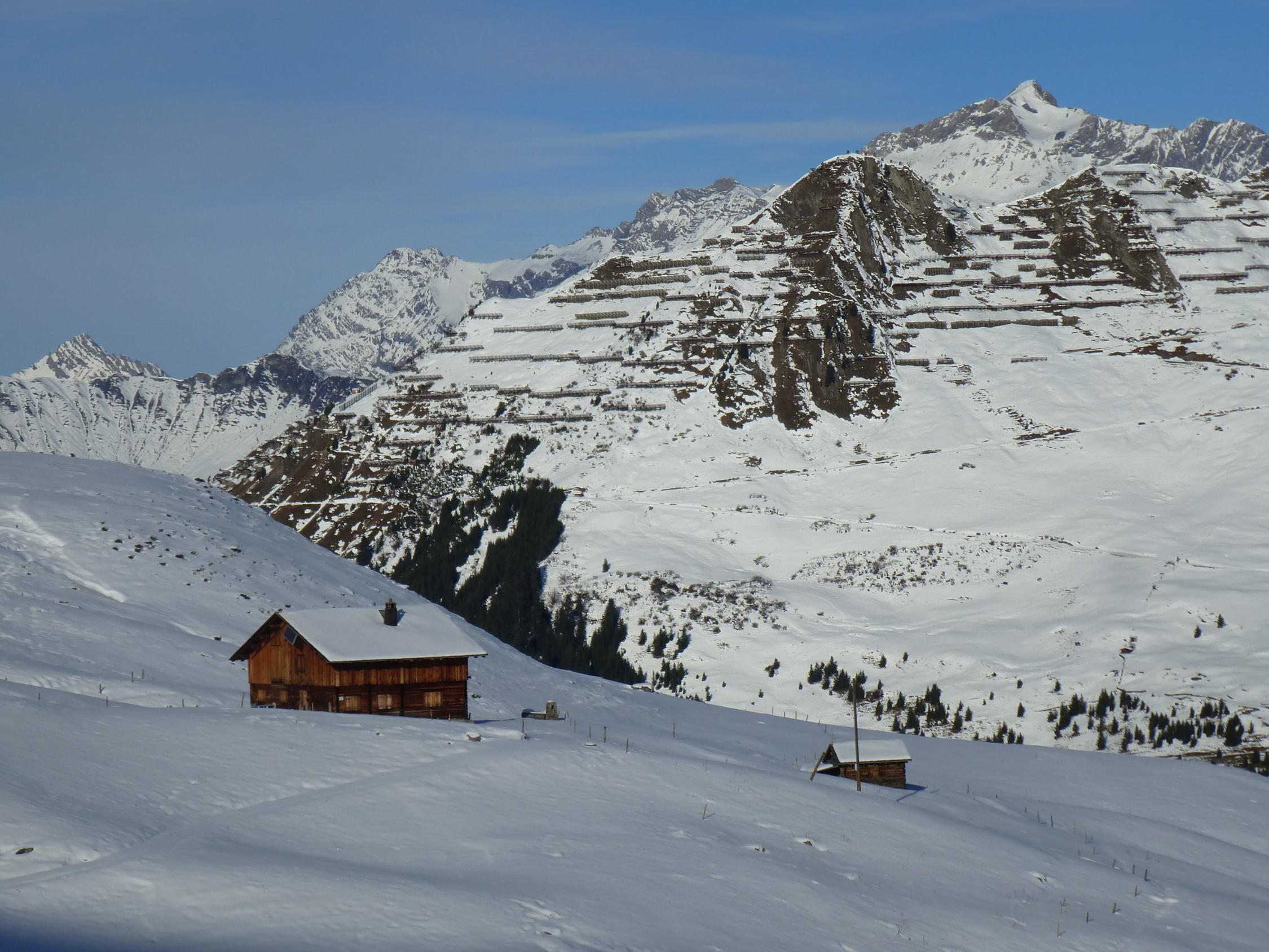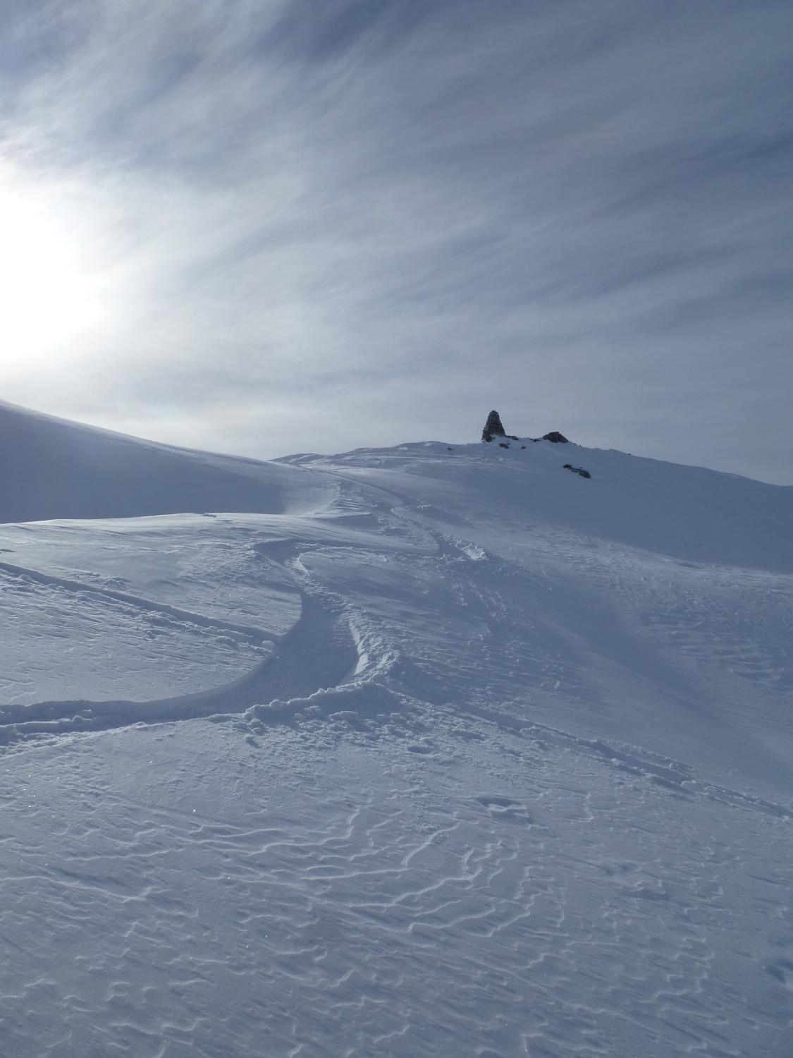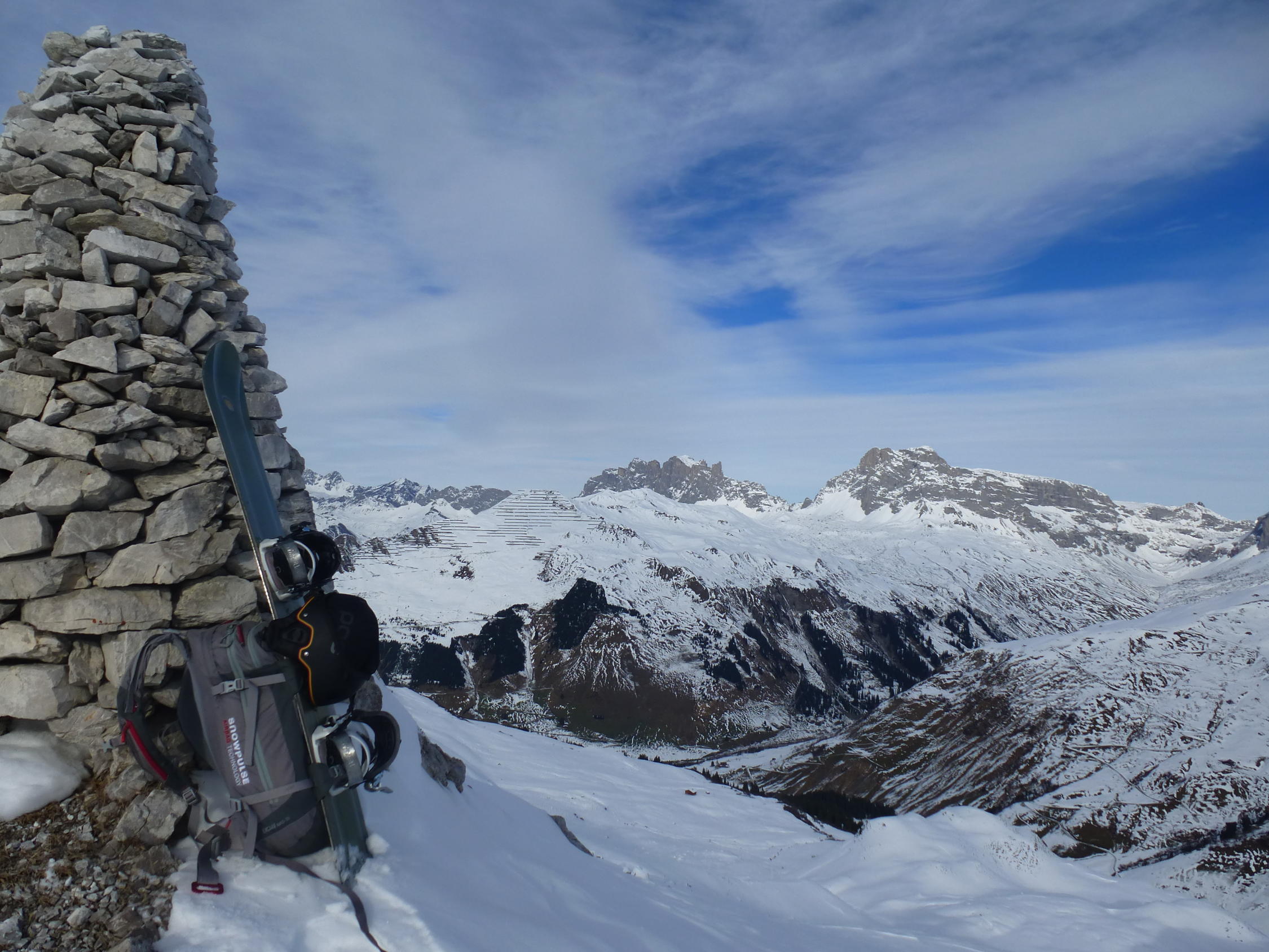 sehr wenig Schnee und häufig Kontakt mit den Alpenrosen oder Steinen. Mit Schneeschuhen und altem Snowboard machbar. Belagverlust inbegriffen.
