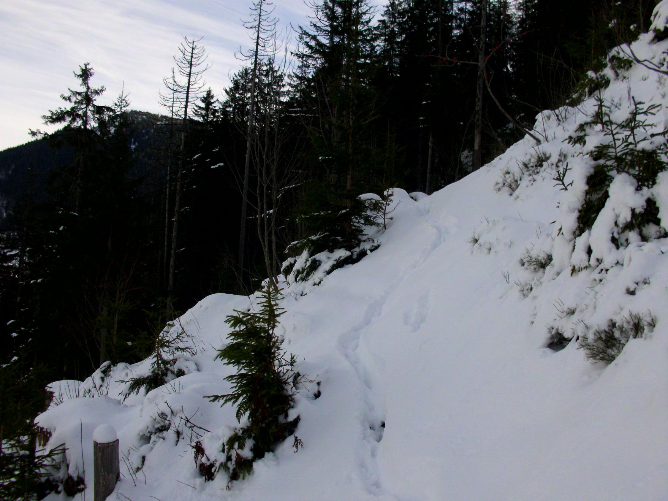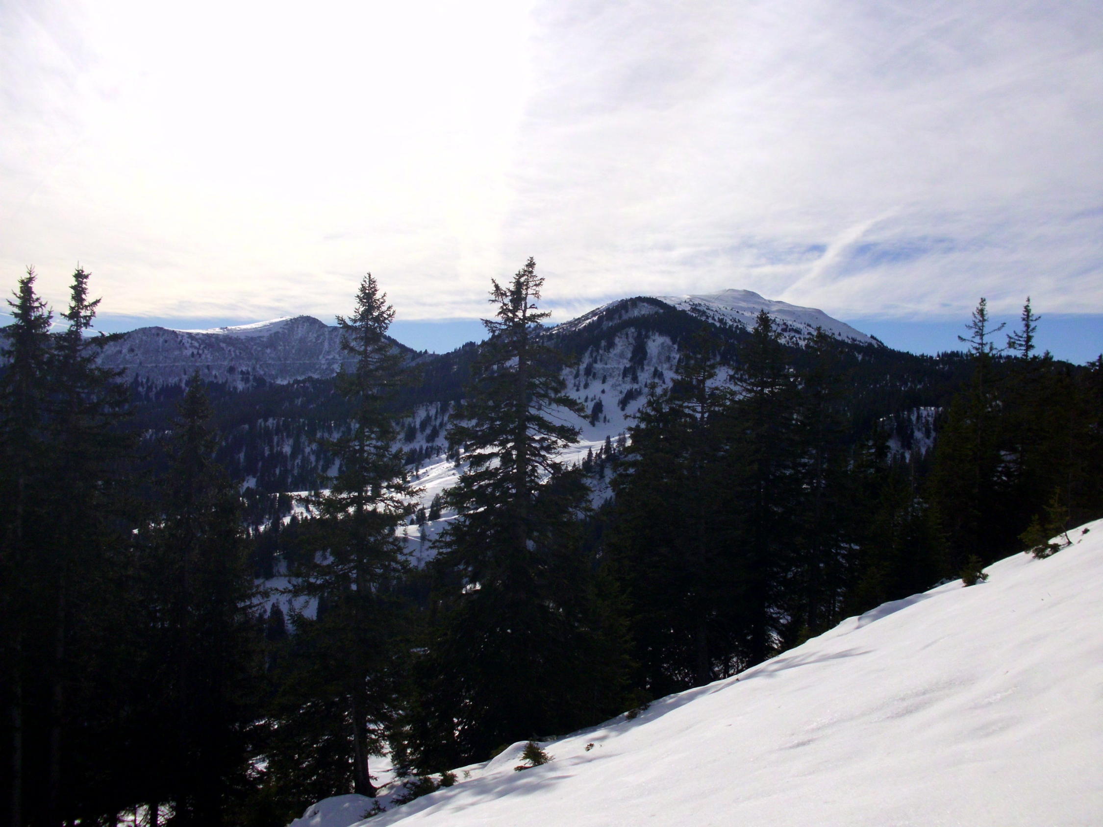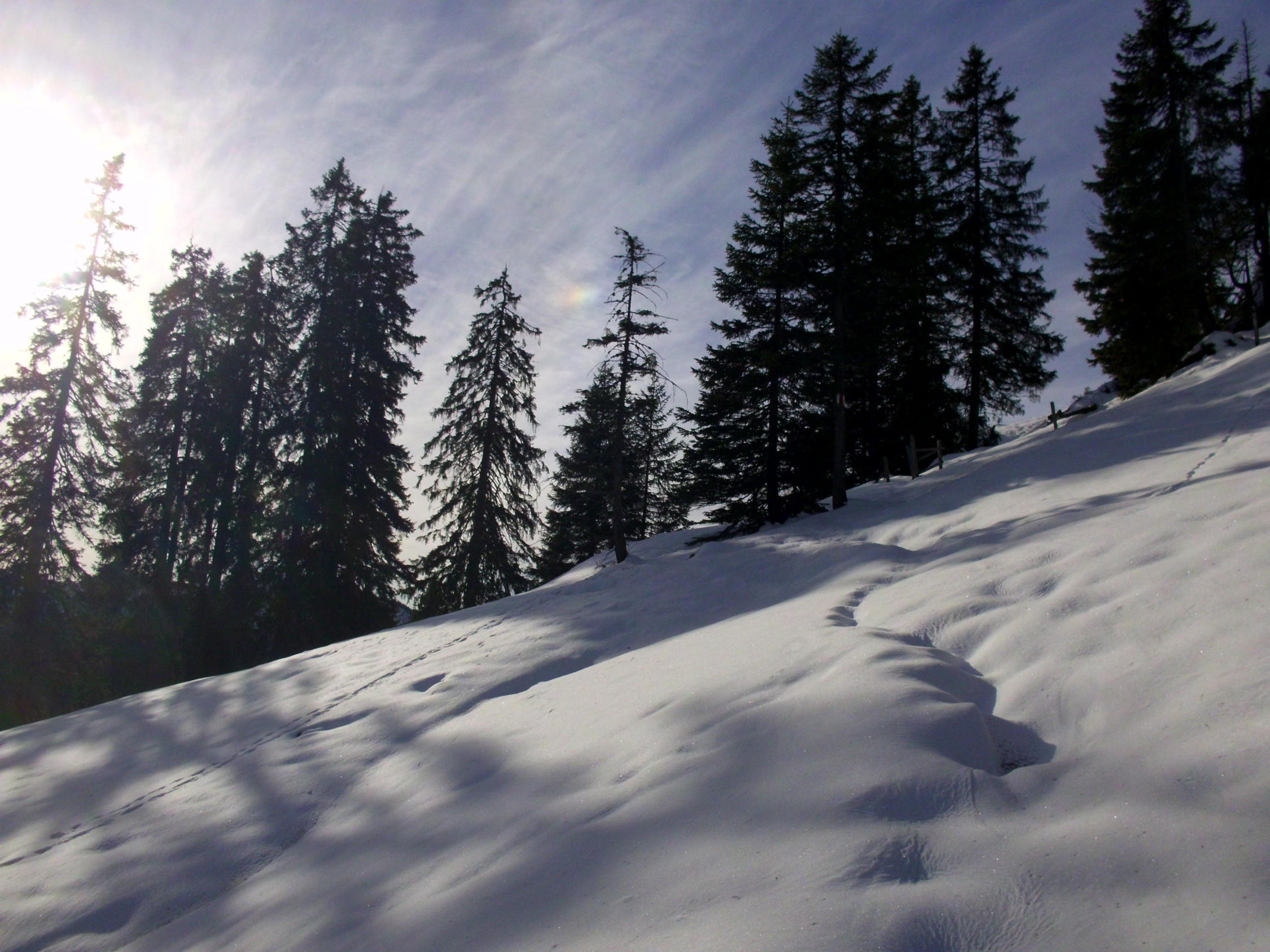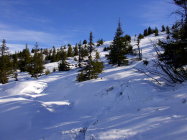 Hat schon erstaunlich viel Schnee auf dieser Höhe im Gebiet...Unten auf 1160m ca 15cm, oberhalb 1600m bis 50cm Lockerschnee, teilweise sinkt man auch mit SS bis in die Alpenrosenstauden...Am Gipfelhang z.t stark verblasen.